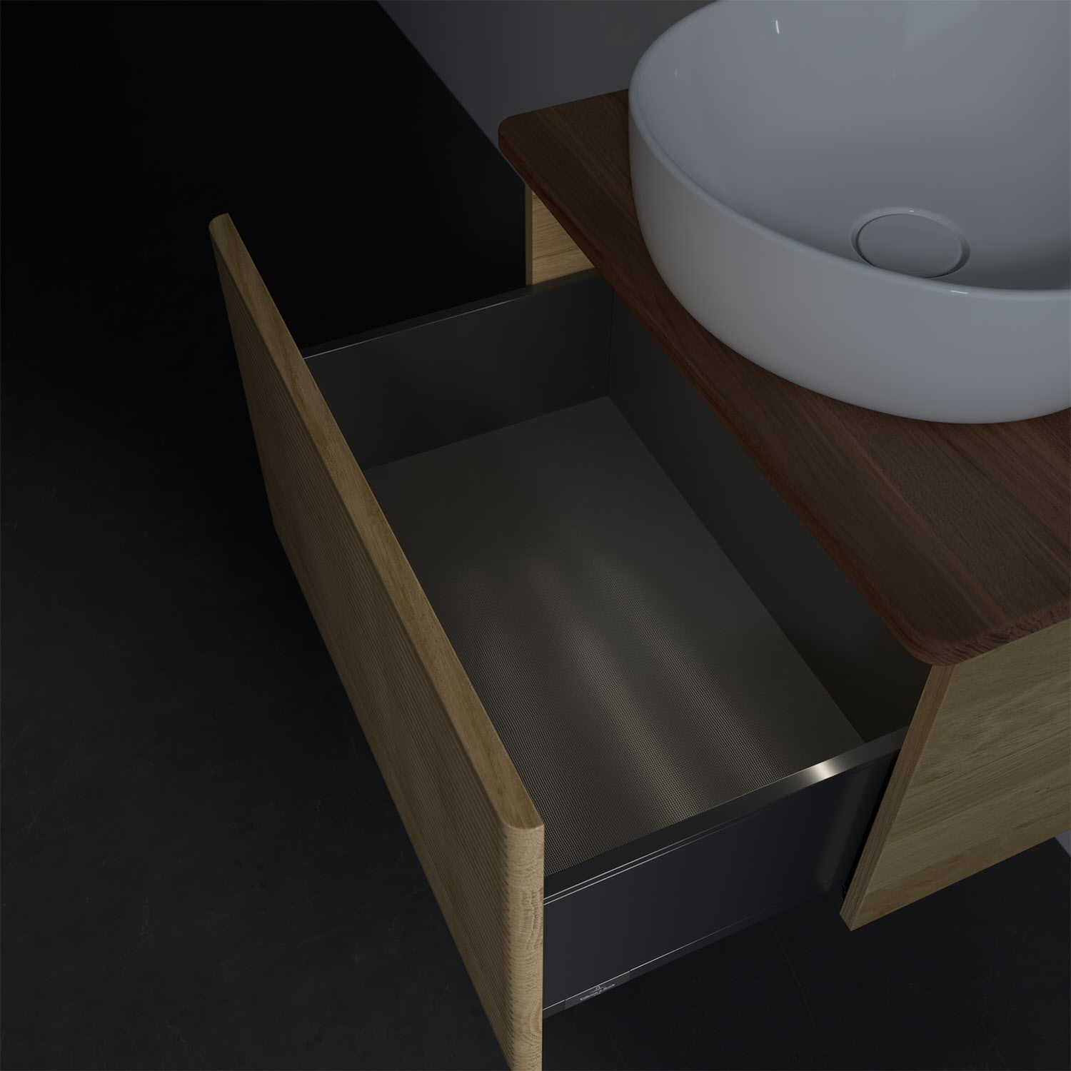 Wenig Platz im Badezimmer und dennoch soll es gemütlich und ordentlich sein? Dann ist der wandhängende Antao Waschtischunterschrank mit seinen sanft abgerundeten Kanten die ideale Lösung. Das geräumige Möbel bietet ausreichend Stauraum für alle nötigen Badutensilien. Zum Öffnen genügt dank der Push-to-Open Funktion ein leichter Druck auf den extra hohen Auszug mit strukturierter Front, der sich dann in seiner vollen Tiefe öffnet. Dabei wird gleichzeitig die angenehme Auszugsbeleuchtung in Warmweiß aktiviert. Das garantiert den benötigen Überblick! Praktisch ist auch der integrierte Antirutschboden und die SoftClosing Funktion, die ein Umfallen oder Verrutschen der verstauten Produkte verhindern. Villeroy & Boch hat alles durchdacht! Für eine besonders leichte Pflege sorgt die mehrschichtig deckend lackierte Oberfläche. Bei der Ausführung in Massivholz wird dank des verarbeiteten Massivholzes jedes Möbel zu einem Unikat, das sich durch das lebendige Naturmaterial durch seine einzigartige Struktur und Maserung auszeichnet.