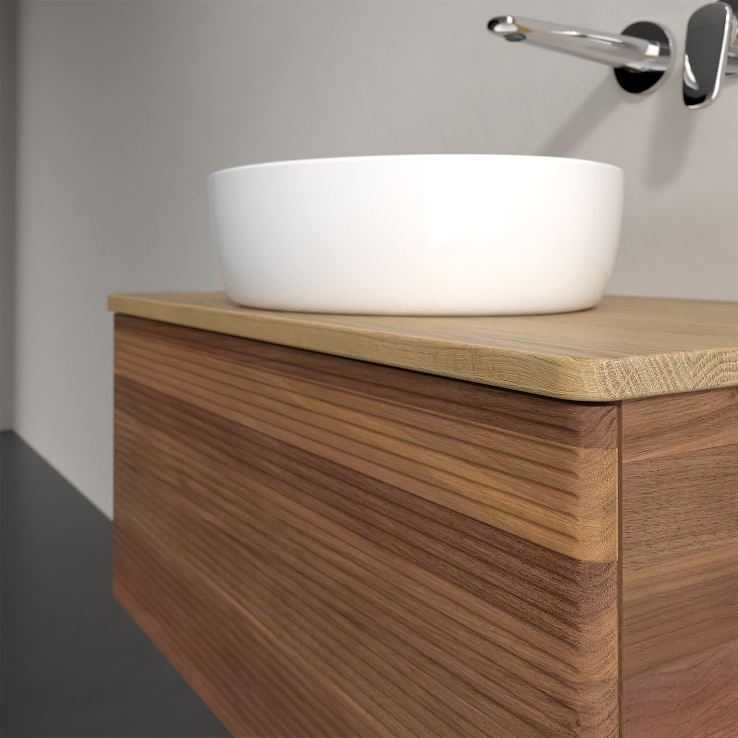 Mit dem wandhängenden Waschtischunterschrank der Kollektion Antao wird ein natürliches und gemütliches Flair am Waschplatz geschaffen. Dafür sorgen die sanfte Formsprache mit abgerundeten Kanten und die strukturierte Front des hochwertigen Badmöbels. Die wichtigsten Badutensilien für die tägliche Routine können seitlich des Waschtischs auf die Waschtischplatte gestellt werden. Ansonsten bietet ein extra hoher Auszug inklusive warmweißer Beleuchtung und Antirutschboden ausreichend Platz für weitere Produkte, die garantiert bleiben, wo sie hingehören. Der Unterschrank verfügt zudem über einen Vollauszug und Selbsteinzug mit SoftClosing Funktion, damit er bequem und mühelos geöffnet und geschlossen werden kann. Gewohnte Qualität von Villeroy & Boch! Für eine besonders leichte Pflege sorgt die mehrschichtig deckend lackierte Oberfläche. Bei der Ausführung in Massivholz wird dank des verarbeiteten Massivholzes jedes Möbel zu einem Unikat, das sich durch das lebendige Naturmaterial durch seine einzigartige Struktur und Maserung auszeichnet.