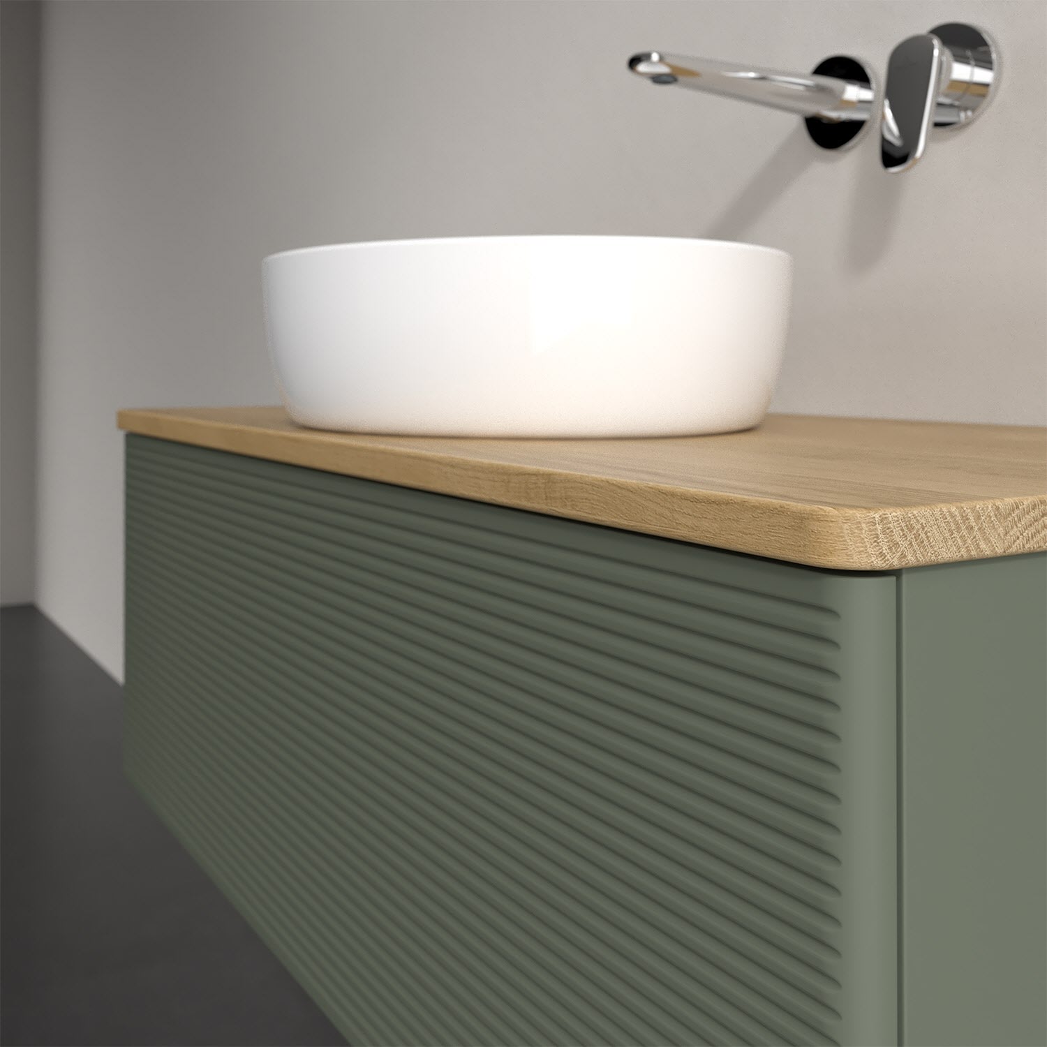 Mit dem wandhängenden Antao Waschtischunterschrank entscheidet man sich für eine hochwertige und praktische Stauraumlösung, die viel Freude bereitet. Die Funktionen sind besonders gut durchdacht: Im Inneren der beiden extra hohen und vollausziehbaren Auszüge können Handtücher, Kosmetik oder andere Pflegeprodukte dank des Antirutschbodens bequem aufbewahrt werden. Geöffnet wird das Möbel durch leichten Druck auf die strukturierte Front. Der Clou: Dabei schaltet sich die warmweiße Auszugsbeleuchtung ein. Natürlich verfügen die Auszüge über eingebaute Dämpfer, die sie anschließend wieder sanft und leise schließen lassen. Auch auf der Waschtischplatte finden die wichtigsten Utensilien seitlich des Waschtischs genügend Platz. Optisch sorgt der Unterschrank von Villeroy & Boch mit seinen abgerundeten Kanten für ein modernes, gemütliches Ambiente. Für eine besonders leichte Pflege sorgt die mehrschichtig deckend lackierte Oberfläche. Bei der Ausführung in Massivholz wird dank des verarbeiteten Massivholzes jedes Möbel zu einem Unikat, das sich durch das lebendige Naturmaterial durch seine einzigartige Struktur und Maserung auszeichnet.