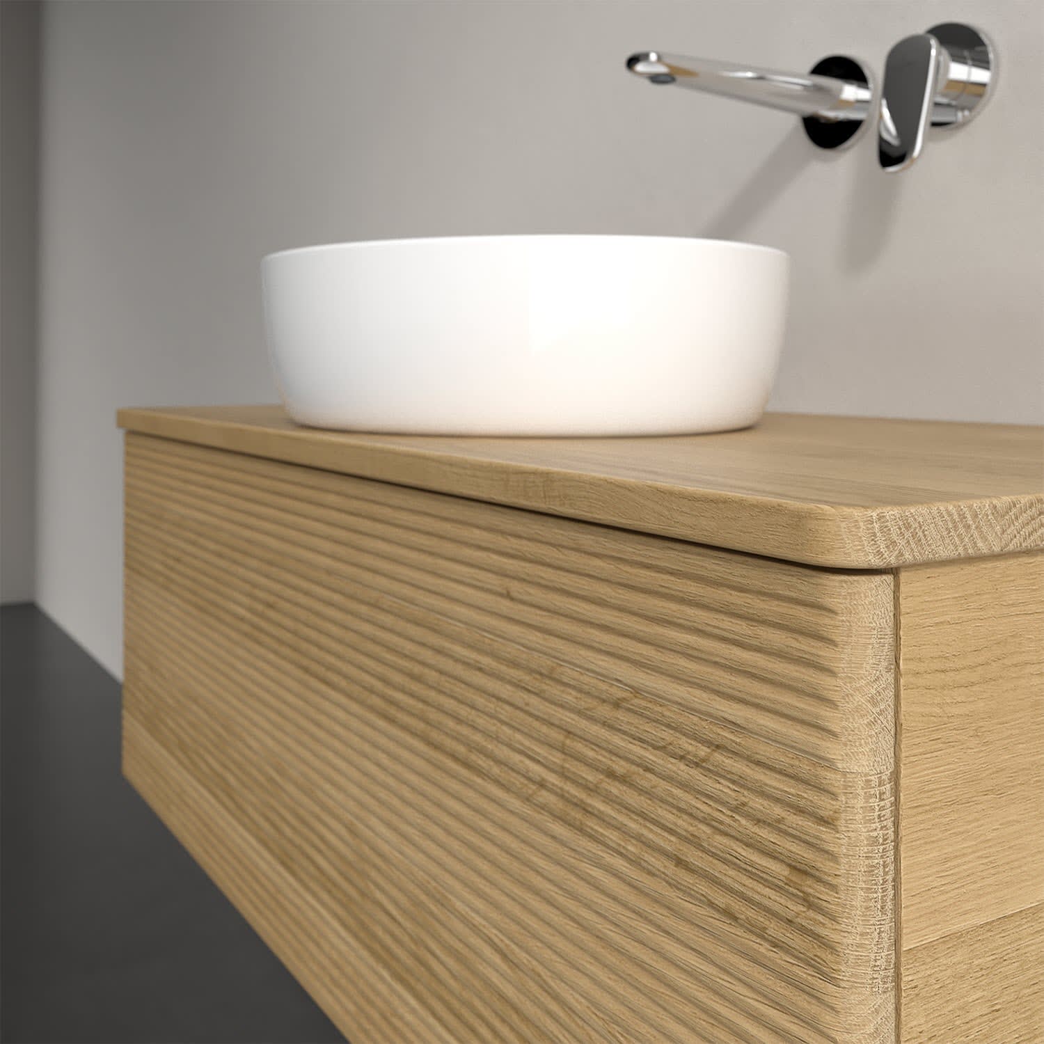 Mit dem wandhängenden Antao Waschtischunterschrank entscheidet man sich für eine hochwertige und praktische Stauraumlösung, die viel Freude bereitet. Die Funktionen sind besonders gut durchdacht: Im Inneren der beiden extra hohen und vollausziehbaren Auszüge können Handtücher, Kosmetik oder andere Pflegeprodukte dank des Antirutschbodens bequem aufbewahrt werden. Geöffnet wird das Möbel durch leichten Druck auf die strukturierte Front. Der Clou: Dabei schaltet sich die warmweiße Auszugsbeleuchtung ein. Natürlich verfügen die Auszüge über eingebaute Dämpfer, die sie anschließend wieder sanft und leise schließen lassen. Auch auf der Waschtischplatte finden die wichtigsten Utensilien seitlich des Waschtischs genügend Platz. Optisch sorgt der Unterschrank von Villeroy & Boch mit seinen abgerundeten Kanten für ein modernes, gemütliches Ambiente. Für eine besonders leichte Pflege sorgt die mehrschichtig deckend lackierte Oberfläche. Bei der Ausführung in Massivholz wird dank des verarbeiteten Massivholzes jedes Möbel zu einem Unikat, das sich durch das lebendige Naturmaterial durch seine einzigartige Struktur und Maserung auszeichnet.