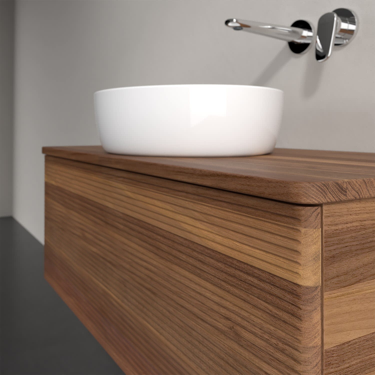 Mit dem wandhängenden Antao Waschtischunterschrank entscheidet man sich für eine hochwertige und praktische Stauraumlösung, die viel Freude bereitet. Die Funktionen sind besonders gut durchdacht: Im Inneren der beiden extra hohen und vollausziehbaren Auszüge können Handtücher, Kosmetik oder andere Pflegeprodukte dank des Antirutschbodens bequem aufbewahrt werden. Geöffnet wird das Möbel durch leichten Druck auf die strukturierte Front. Der Clou: Dabei schaltet sich die warmweiße Auszugsbeleuchtung ein. Natürlich verfügen die Auszüge über eingebaute Dämpfer, die sie anschließend wieder sanft und leise schließen lassen. Auch auf der Waschtischplatte finden die wichtigsten Utensilien seitlich des Waschtischs genügend Platz. Optisch sorgt der Unterschrank von Villeroy & Boch mit seinen abgerundeten Kanten für ein modernes, gemütliches Ambiente. Für eine besonders leichte Pflege sorgt die mehrschichtig deckend lackierte Oberfläche. Bei der Ausführung in Massivholz wird dank des verarbeiteten Massivholzes jedes Möbel zu einem Unikat, das sich durch das lebendige Naturmaterial durch seine einzigartige Struktur und Maserung auszeichnet.