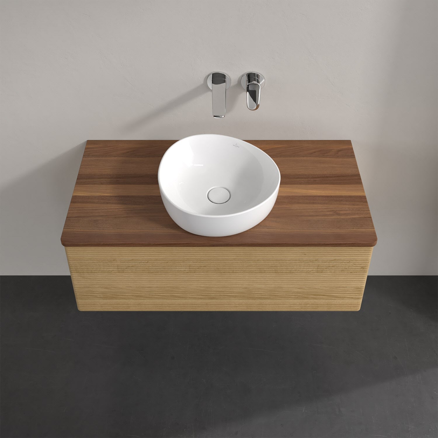 Für diesen Waschbeckenunterschrank stehen Ihnen Aufsatzwaschtische aus verschiedenen Serien zur Verfügung (siehe "Passliste" unter Downloads). Ein ausgewähltes Beispiel finden Sie im Zubehör. Den Waschtisch bitte separat mitbestellen.