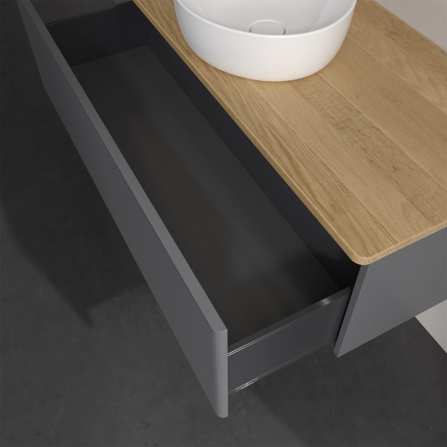 Der wandhängende Antao Waschtischunterschrank von Villeroy & Boch bietet nicht nur jede Menge Stauraum – er ist dank seines naturinspirierten Designs mit seinen abgerundeten Kanten auch noch besonders stilvoll und schafft eine gemütliche Atmosphäre im Badezimmer. Auf der Waschtischplatte bietet sich rechts und links neben dem Waschtisch viel Platz für Zahnbürstenbecher oder Seifenspender. Ein extra hoher Auszug bietet viel Platz, um alles Notwendige zu verstauen und Ordnung zu halten. Öffnen lässt er sich durch leichten Druck auf die strukturierte Front. Dabei aktiviert sich übrigens die Auszugsbeleuchtung in angenehmem Warmweiß. Dank Vollauszug hat man immer alles im Blick und der Antirutschboden verhindert ein Umfallen oder Verrutschen der Gegenstände. Einfach clever! Für eine besonders leichte Pflege sorgt die mehrschichtig deckend lackierte Oberfläche. Bei der Ausführung in Massivholz wird dank des verarbeiteten Massivholzes jedes Möbel zu einem Unikat, das sich durch das lebendige Naturmaterial durch seine einzigartige Struktur und Maserung auszeichnet.