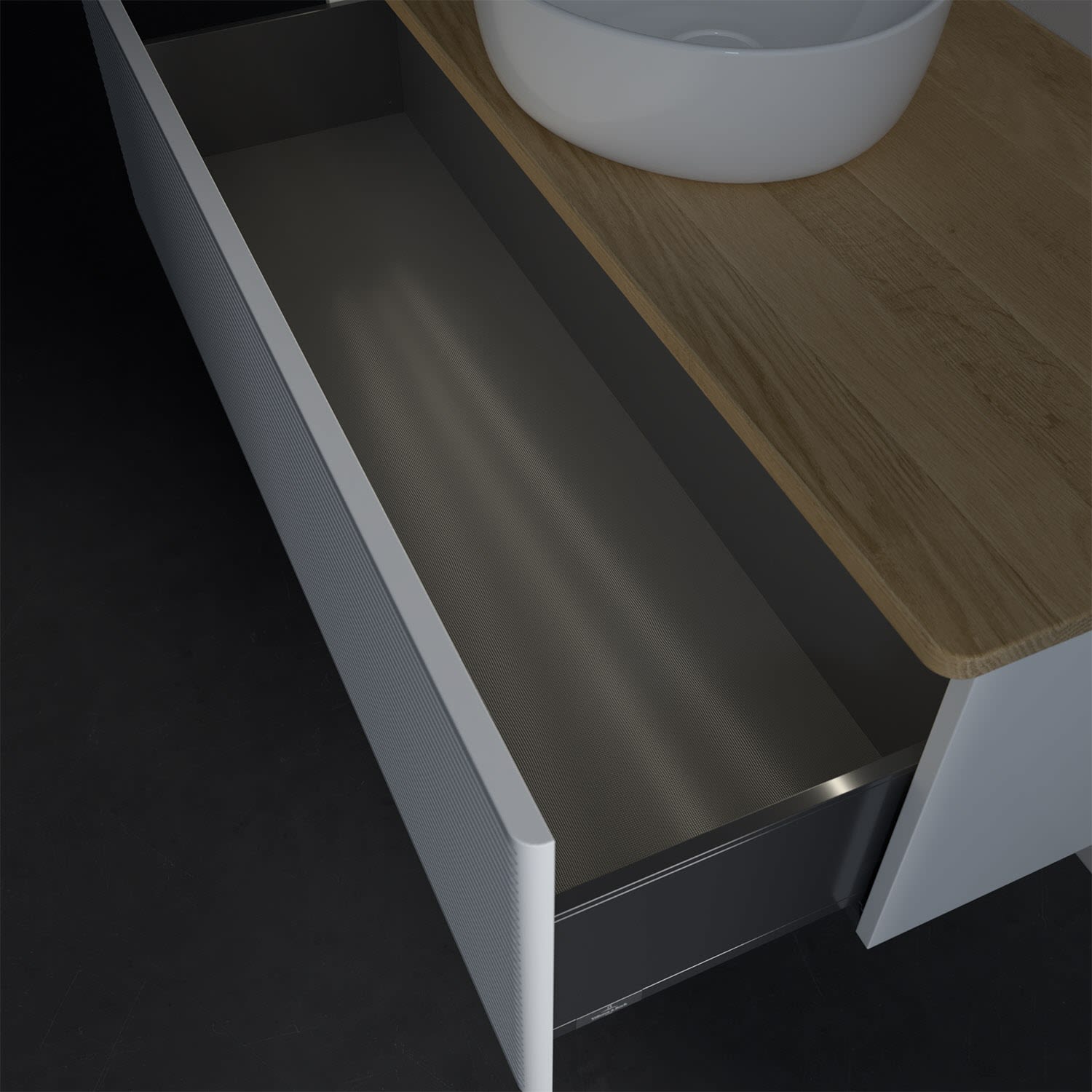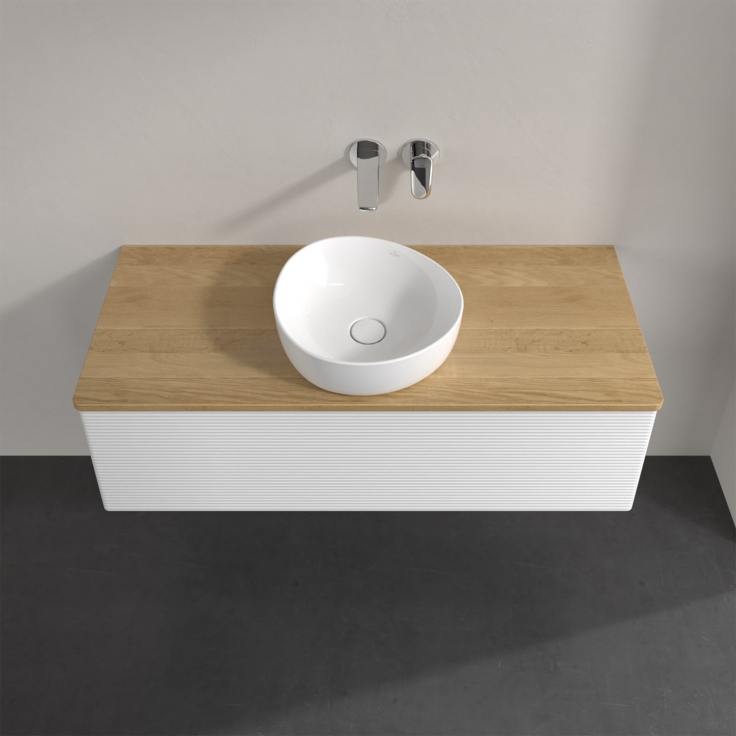 Der wandhängende Antao Waschtischunterschrank von Villeroy & Boch bietet nicht nur jede Menge Stauraum – er ist dank seines naturinspirierten Designs mit seinen abgerundeten Kanten auch noch besonders stilvoll und schafft eine gemütliche Atmosphäre im Badezimmer. Auf der Waschtischplatte bietet sich rechts und links neben dem Waschtisch viel Platz für Zahnbürstenbecher oder Seifenspender. Ein extra hoher Auszug bietet viel Platz, um alles Notwendige zu verstauen und Ordnung zu halten. Öffnen lässt er sich durch leichten Druck auf die strukturierte Front. Dabei aktiviert sich übrigens die Auszugsbeleuchtung in angenehmem Warmweiß. Dank Vollauszug hat man immer alles im Blick und der Antirutschboden verhindert ein Umfallen oder Verrutschen der Gegenstände. Einfach clever! Für eine besonders leichte Pflege sorgt die mehrschichtig deckend lackierte Oberfläche. Bei der Ausführung in Massivholz wird dank des verarbeiteten Massivholzes jedes Möbel zu einem Unikat, das sich durch das lebendige Naturmaterial durch seine einzigartige Struktur und Maserung auszeichnet.