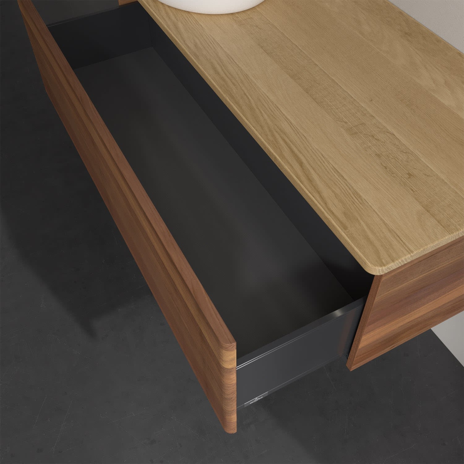 Der wandhängende Antao Waschtischunterschrank von Villeroy & Boch bietet nicht nur jede Menge Stauraum – er ist dank seines naturinspirierten Designs mit seinen abgerundeten Kanten auch noch besonders stilvoll und schafft eine gemütliche Atmosphäre im Badezimmer. Auf der Waschtischplatte bietet sich seitlich des Waschtischs viel Platz für Zahnbürstenbecher oder Seifenspender. Ein extra hoher Auszug bietet viel Platz, um alles Notwendige zu verstauen und Ordnung zu halten. Öffnen lässt er sich durch leichten Druck auf die strukturierte Front. Dabei aktiviert sich übrigens die Auszugsbeleuchtung in angenehmem Warmweiß. Dank Vollauszug hat man immer alles im Blick und der Antirutschboden verhindert ein Umfallen oder Verrutschen der Gegenstände. Einfach clever! Für eine besonders leichte Pflege sorgt die mehrschichtig deckend lackierte Oberfläche. Bei der Ausführung in Massivholz wird dank des verarbeiteten Massivholzes jedes Möbel zu einem Unikat, das sich durch das lebendige Naturmaterial durch seine einzigartige Struktur und Maserung auszeichnet.