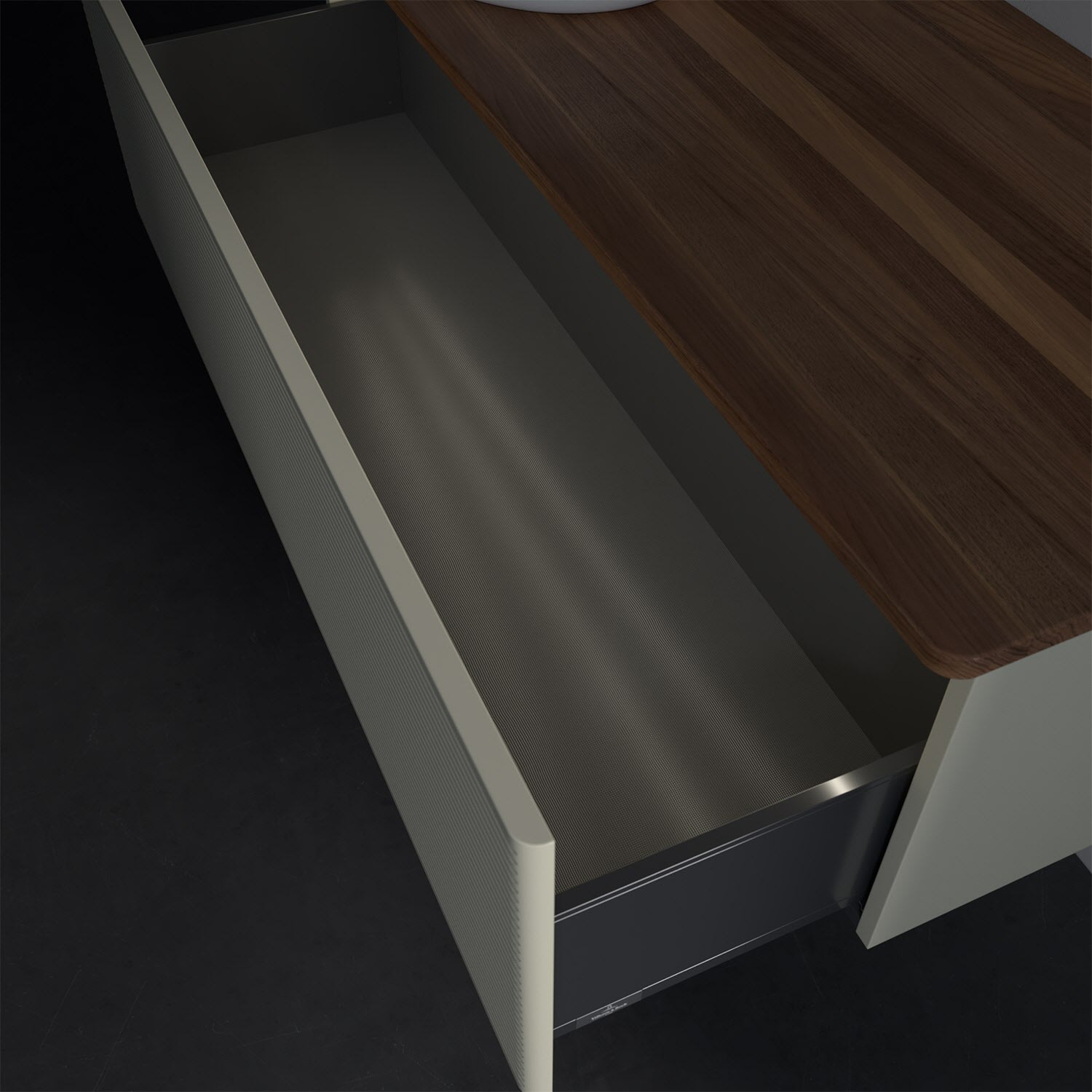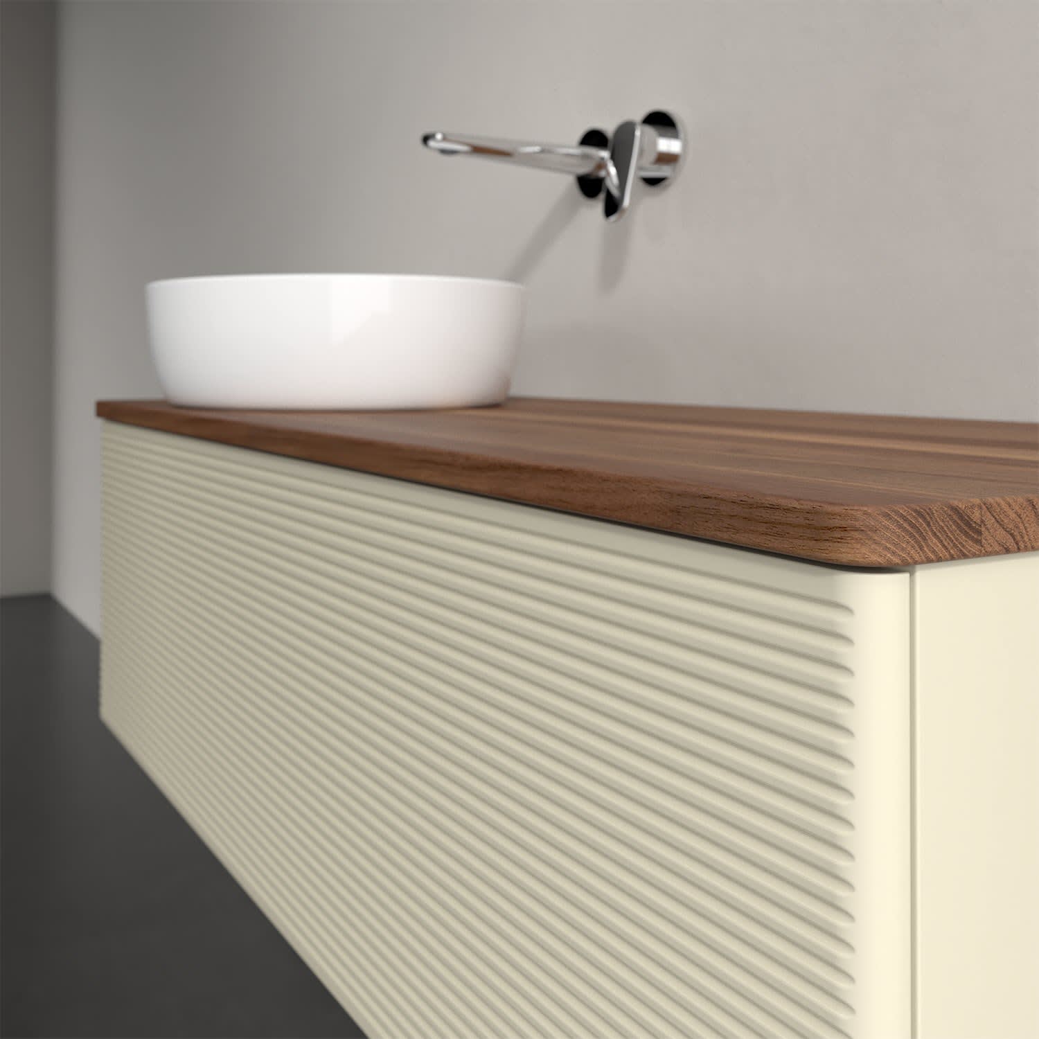 Der wandhängende Antao Waschtischunterschrank von Villeroy & Boch bietet nicht nur jede Menge Stauraum – er ist dank seines naturinspirierten Designs mit seinen abgerundeten Kanten auch noch besonders stilvoll und schafft eine gemütliche Atmosphäre im Badezimmer. Auf der Waschtischplatte bietet sich seitlich des Waschtischs viel Platz für Zahnbürstenbecher oder Seifenspender. Ein extra hoher Auszug bietet viel Platz, um alles Notwendige zu verstauen und Ordnung zu halten. Öffnen lässt er sich durch leichten Druck auf die strukturierte Front. Dabei aktiviert sich übrigens die Auszugsbeleuchtung in angenehmem Warmweiß. Dank Vollauszug hat man immer alles im Blick und der Antirutschboden verhindert ein Umfallen oder Verrutschen der Gegenstände. Einfach clever! Für eine besonders leichte Pflege sorgt die mehrschichtig deckend lackierte Oberfläche. Bei der Ausführung in Massivholz wird dank des verarbeiteten Massivholzes jedes Möbel zu einem Unikat, das sich durch das lebendige Naturmaterial durch seine einzigartige Struktur und Maserung auszeichnet.