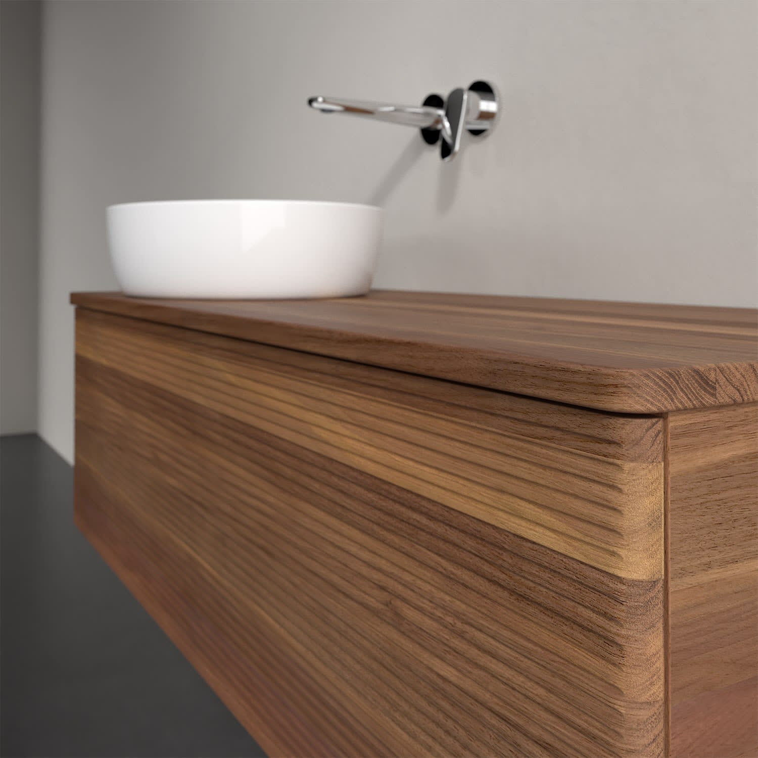 Der wandhängende Antao Waschtischunterschrank von Villeroy & Boch bietet nicht nur jede Menge Stauraum – er ist dank seines naturinspirierten Designs mit seinen abgerundeten Kanten auch noch besonders stilvoll und schafft eine gemütliche Atmosphäre im Badezimmer. Auf der Waschtischplatte bietet sich seitlich des Waschtischs viel Platz für Zahnbürstenbecher oder Seifenspender. Ein extra hoher Auszug bietet viel Platz, um alles Notwendige zu verstauen und Ordnung zu halten. Öffnen lässt er sich durch leichten Druck auf die strukturierte Front. Dabei aktiviert sich übrigens die Auszugsbeleuchtung in angenehmem Warmweiß. Dank Vollauszug hat man immer alles im Blick und der Antirutschboden verhindert ein Umfallen oder Verrutschen der Gegenstände. Einfach clever! Für eine besonders leichte Pflege sorgt die mehrschichtig deckend lackierte Oberfläche. Bei der Ausführung in Massivholz wird dank des verarbeiteten Massivholzes jedes Möbel zu einem Unikat, das sich durch das lebendige Naturmaterial durch seine einzigartige Struktur und Maserung auszeichnet.