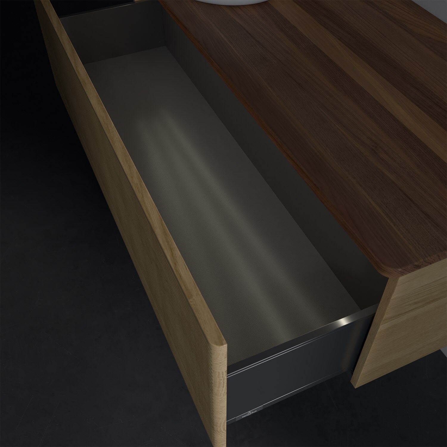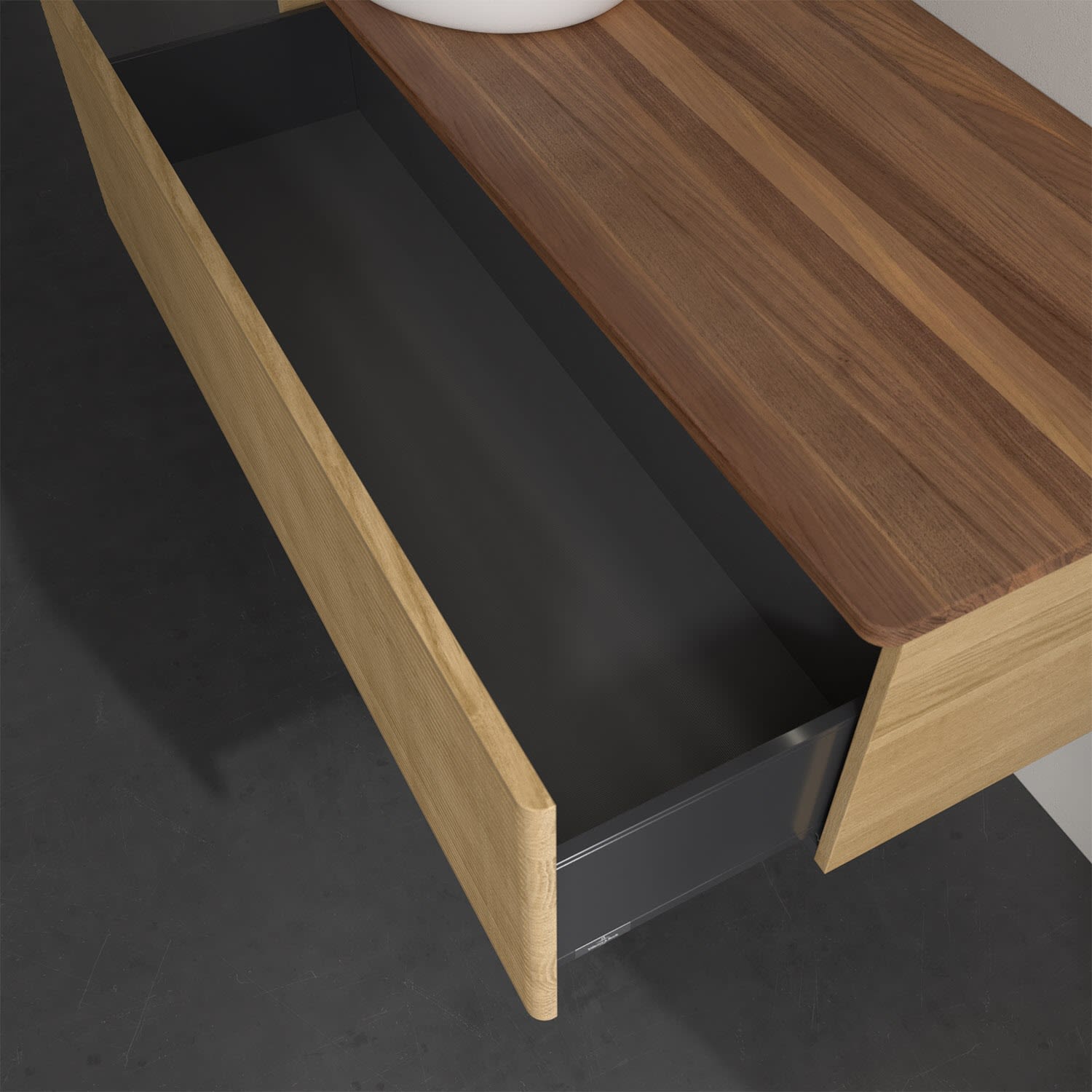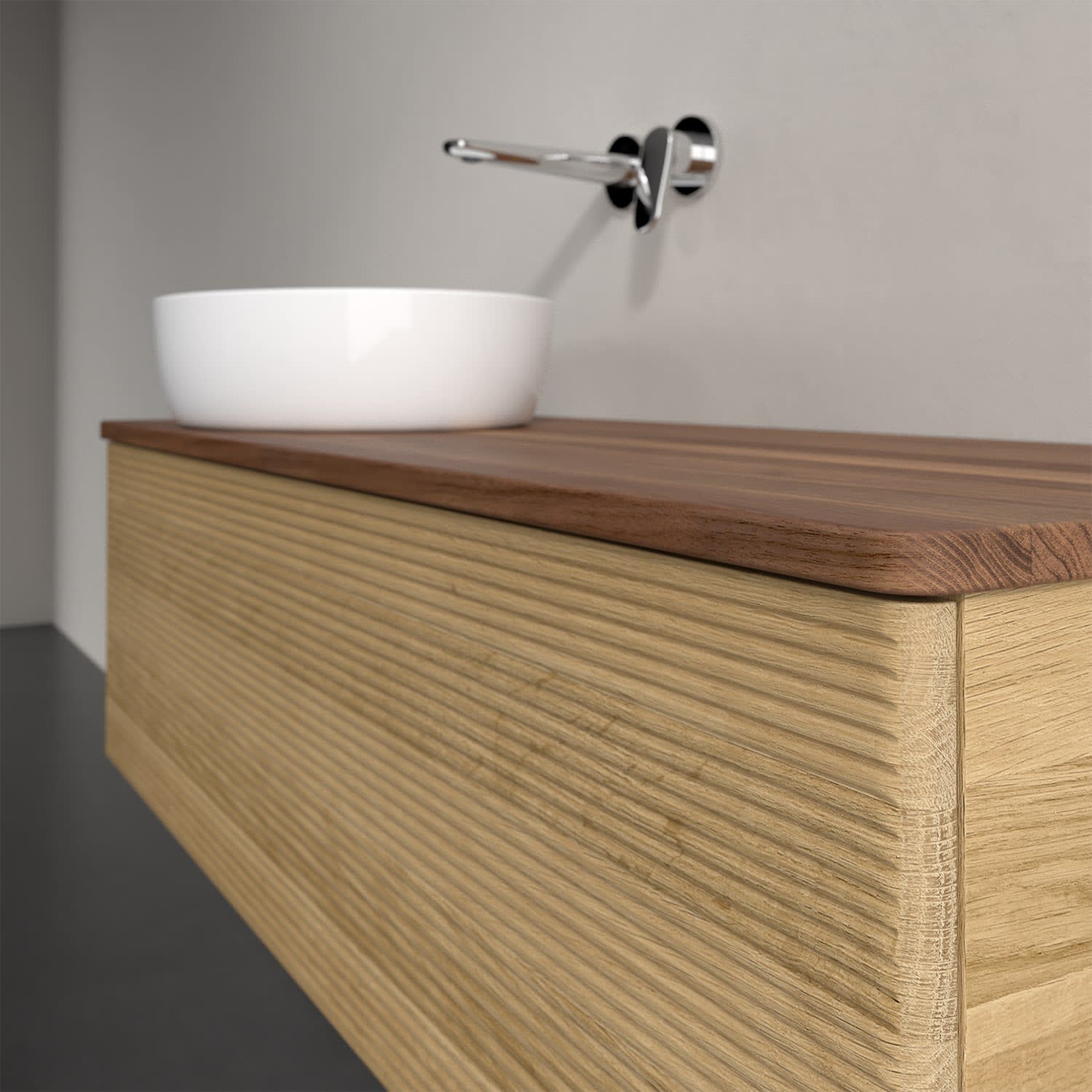 Der wandhängende Antao Waschtischunterschrank von Villeroy & Boch bietet nicht nur jede Menge Stauraum – er ist dank seines naturinspirierten Designs mit seinen abgerundeten Kanten auch noch besonders stilvoll und schafft eine gemütliche Atmosphäre im Badezimmer. Auf der Waschtischplatte bietet sich seitlich des Waschtischs viel Platz für Zahnbürstenbecher oder Seifenspender. Ein extra hoher Auszug bietet viel Platz, um alles Notwendige zu verstauen und Ordnung zu halten. Öffnen lässt er sich durch leichten Druck auf die strukturierte Front. Dabei aktiviert sich übrigens die Auszugsbeleuchtung in angenehmem Warmweiß. Dank Vollauszug hat man immer alles im Blick und der Antirutschboden verhindert ein Umfallen oder Verrutschen der Gegenstände. Einfach clever! Für eine besonders leichte Pflege sorgt die mehrschichtig deckend lackierte Oberfläche. Bei der Ausführung in Massivholz wird dank des verarbeiteten Massivholzes jedes Möbel zu einem Unikat, das sich durch das lebendige Naturmaterial durch seine einzigartige Struktur und Maserung auszeichnet.