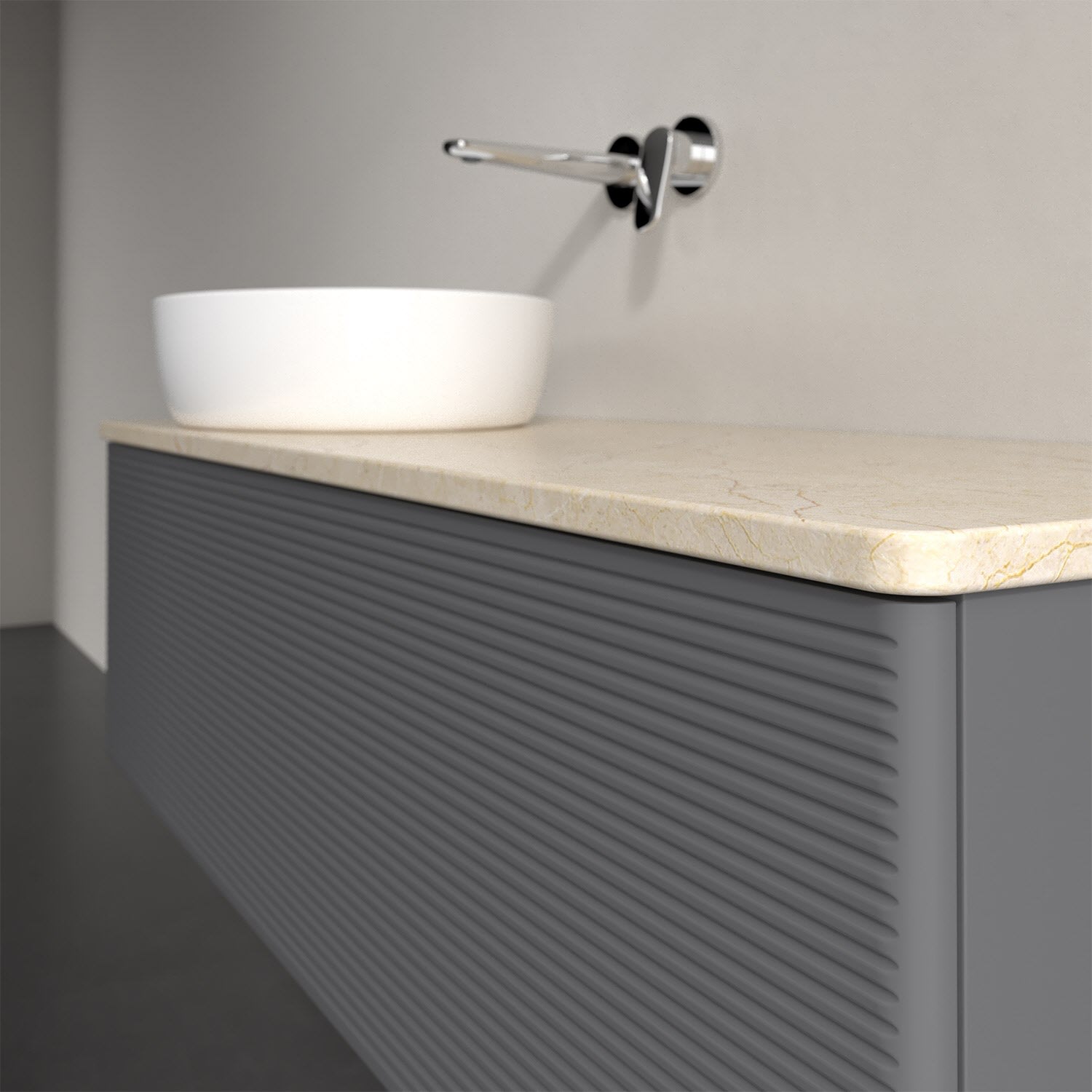 Der wandhängende Antao Waschtischunterschrank von Villeroy & Boch bietet nicht nur jede Menge Stauraum – er ist dank seines naturinspirierten Designs mit seinen abgerundeten Kanten auch noch besonders stilvoll und schafft eine gemütliche Atmosphäre im Badezimmer. Auf der Waschtischplatte bietet sich seitlich des Waschtischs viel Platz für Zahnbürstenbecher oder Seifenspender. Ein extra hoher Auszug bietet viel Platz, um alles Notwendige zu verstauen und Ordnung zu halten. Öffnen lässt er sich durch leichten Druck auf die strukturierte Front. Dabei aktiviert sich übrigens die Auszugsbeleuchtung in angenehmem Warmweiß. Dank Vollauszug hat man immer alles im Blick und der Antirutschboden verhindert ein Umfallen oder Verrutschen der Gegenstände. Einfach clever! Für eine besonders leichte Pflege sorgt die mehrschichtig deckend lackierte Oberfläche. Bei der Ausführung in Massivholz wird dank des verarbeiteten Massivholzes jedes Möbel zu einem Unikat, das sich durch das lebendige Naturmaterial durch seine einzigartige Struktur und Maserung auszeichnet.