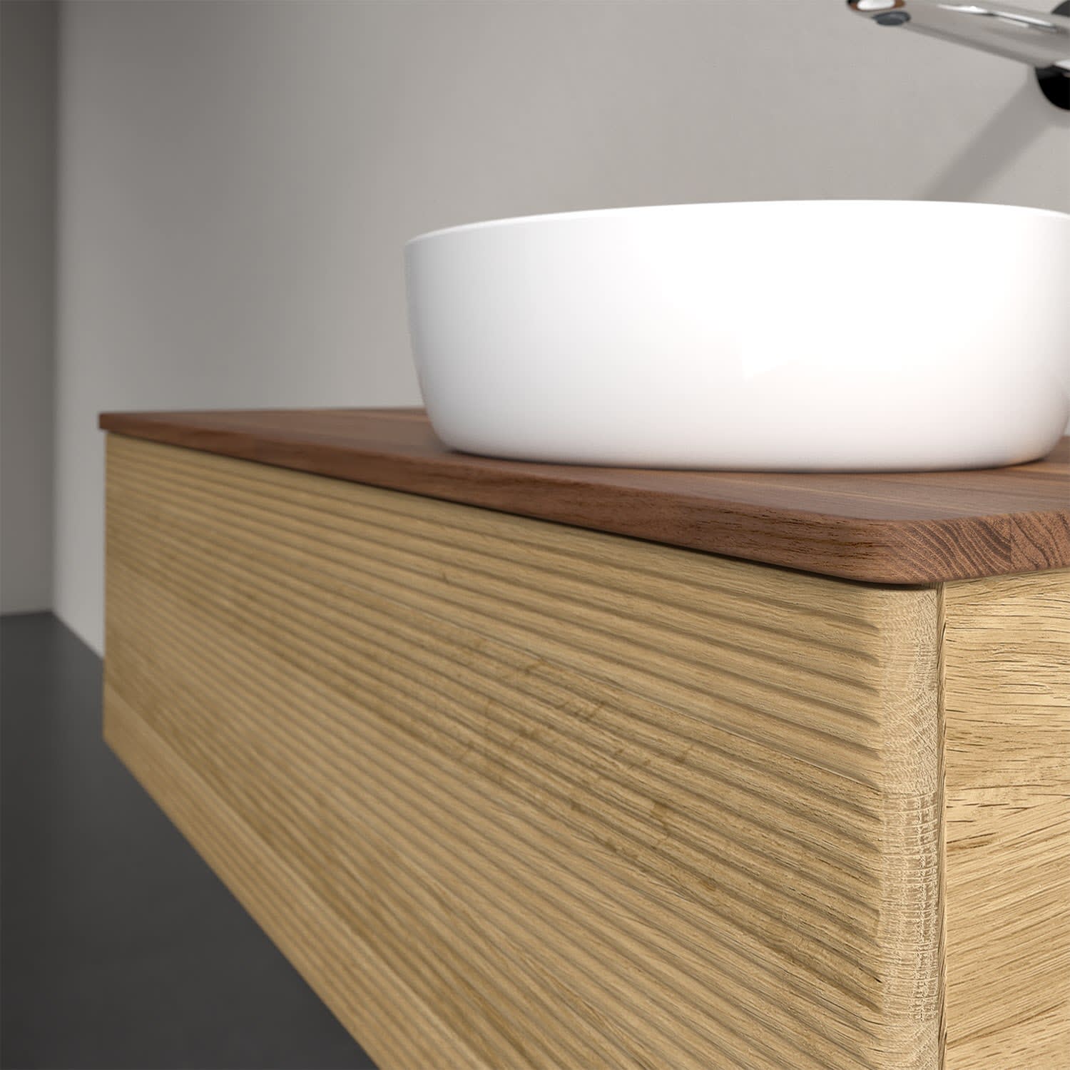 Der wandhängende Antao Waschtischunterschrank von Villeroy & Boch bietet nicht nur jede Menge Stauraum – er ist dank seines naturinspirierten Designs mit seinen abgerundeten Kanten auch noch besonders stilvoll und schafft eine gemütliche Atmosphäre im Badezimmer. Auf der Waschtischplatte bietet sich seitlich des Waschtischs viel Platz für Zahnbürstenbecher oder Seifenspender. Ein extra hoher Auszug bietet viel Platz, um alles Notwendige zu verstauen und Ordnung zu halten. Öffnen lässt er sich durch leichten Druck auf die strukturierte Front. Dabei aktiviert sich übrigens die Auszugsbeleuchtung in angenehmem Warmweiß. Dank Vollauszug hat man immer alles im Blick und der Antirutschboden verhindert ein Umfallen oder Verrutschen der Gegenstände. Einfach clever! Für eine besonders leichte Pflege sorgt die mehrschichtig deckend lackierte Oberfläche. Bei der Ausführung in Massivholz wird dank des verarbeiteten Massivholzes jedes Möbel zu einem Unikat, das sich durch das lebendige Naturmaterial durch seine einzigartige Struktur und Maserung auszeichnet.