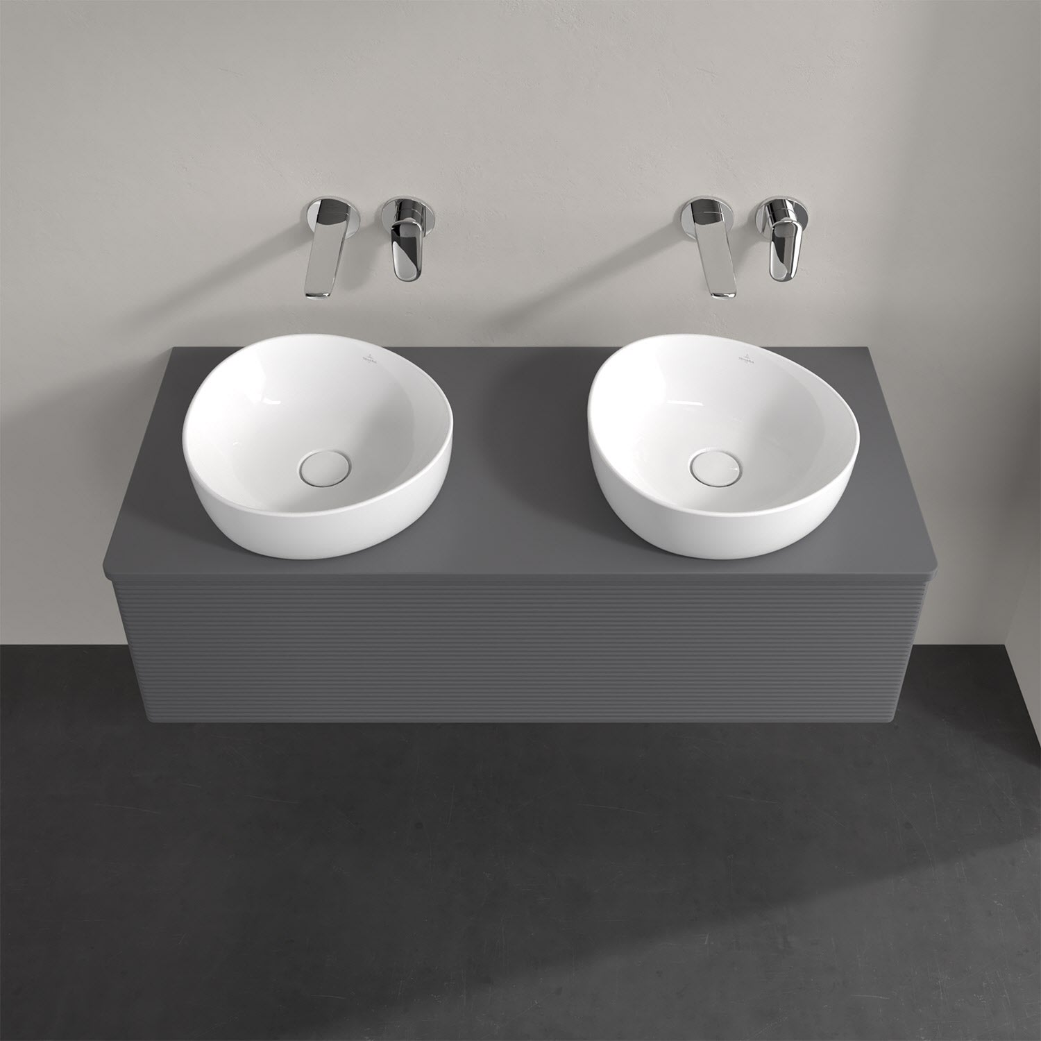 Der wandhängende Antao Waschtischunterschrank von Villeroy & Boch bietet nicht nur jede Menge Stauraum – er ist dank seines naturinspirierten Designs mit seinen abgerundeten Kanten auch noch besonders stilvoll und schafft eine gemütliche Atmosphäre im Badezimmer. Kombiniert mit zwei passenden Aufsatzwaschtischen also die ideale Wahl. Ein extra hoher Auszug bietet viel Platz, um alles Notwendige zu verstauen und Ordnung zu halten. Öffnen lässt er sich durch leichten Druck auf die strukturierte Front. Dabei aktiviert sich übrigens die Auszugsbeleuchtung in angenehmem Warmweiß. Dank Vollauszug hat man immer alles im Blick und der Antirutschboden verhindert ein Umfallen oder Verrutschen der Gegenstände. Einfach clever! Für eine besonders leichte Pflege sorgt die mehrschichtig deckend lackierte Oberfläche.