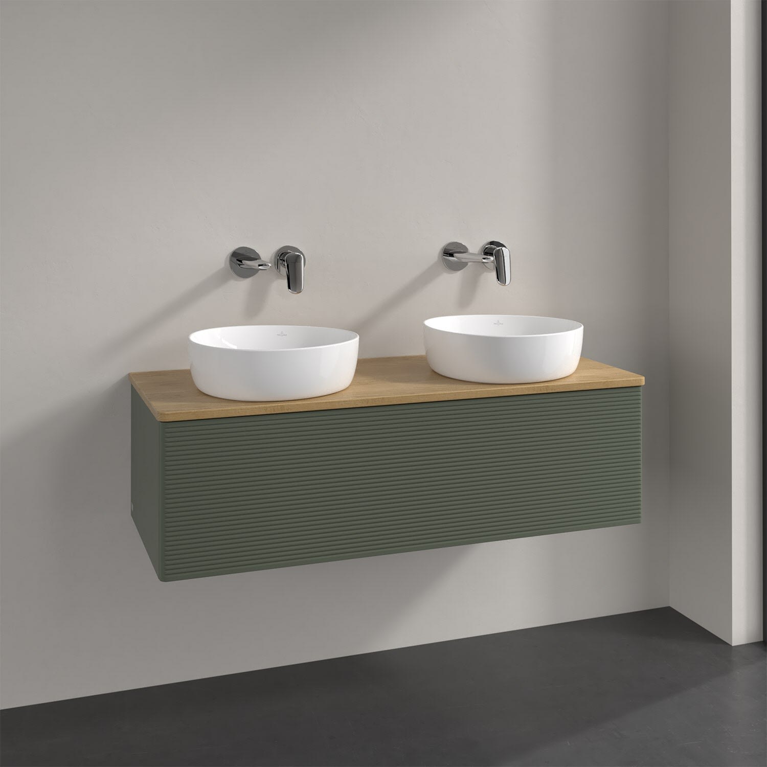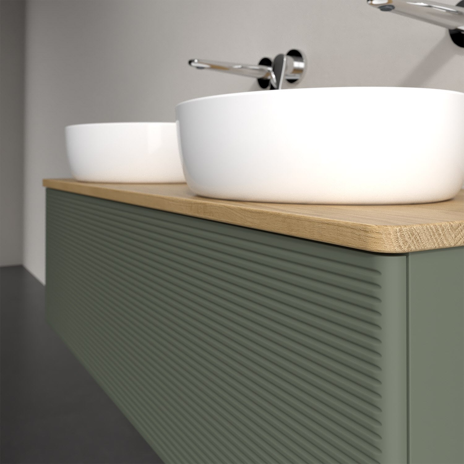 Der wandhängende Antao Waschtischunterschrank von Villeroy & Boch bietet nicht nur jede Menge Stauraum – er ist dank seines naturinspirierten Designs mit seinen abgerundeten Kanten auch noch besonders stilvoll und schafft eine gemütliche Atmosphäre im Badezimmer. Kombiniert mit zwei passenden Aufsatzwaschtischen also die ideale Wahl. Ein extra hoher Auszug bietet viel Platz, um alles Notwendige zu verstauen und Ordnung zu halten. Öffnen lässt er sich durch leichten Druck auf die strukturierte Front. Dabei aktiviert sich übrigens die Auszugsbeleuchtung in angenehmem Warmweiß. Dank Vollauszug hat man immer alles im Blick und der Antirutschboden verhindert ein Umfallen oder Verrutschen der Gegenstände. Einfach clever! Für eine besonders leichte Pflege sorgt die mehrschichtig deckend lackierte Oberfläche. Bei der Ausführung in Massivholz wird dank des verarbeiteten Massivholzes jedes Möbel zu einem Unikat, das sich durch das lebendige Naturmaterial durch seine einzigartige Struktur und Maserung auszeichnet.