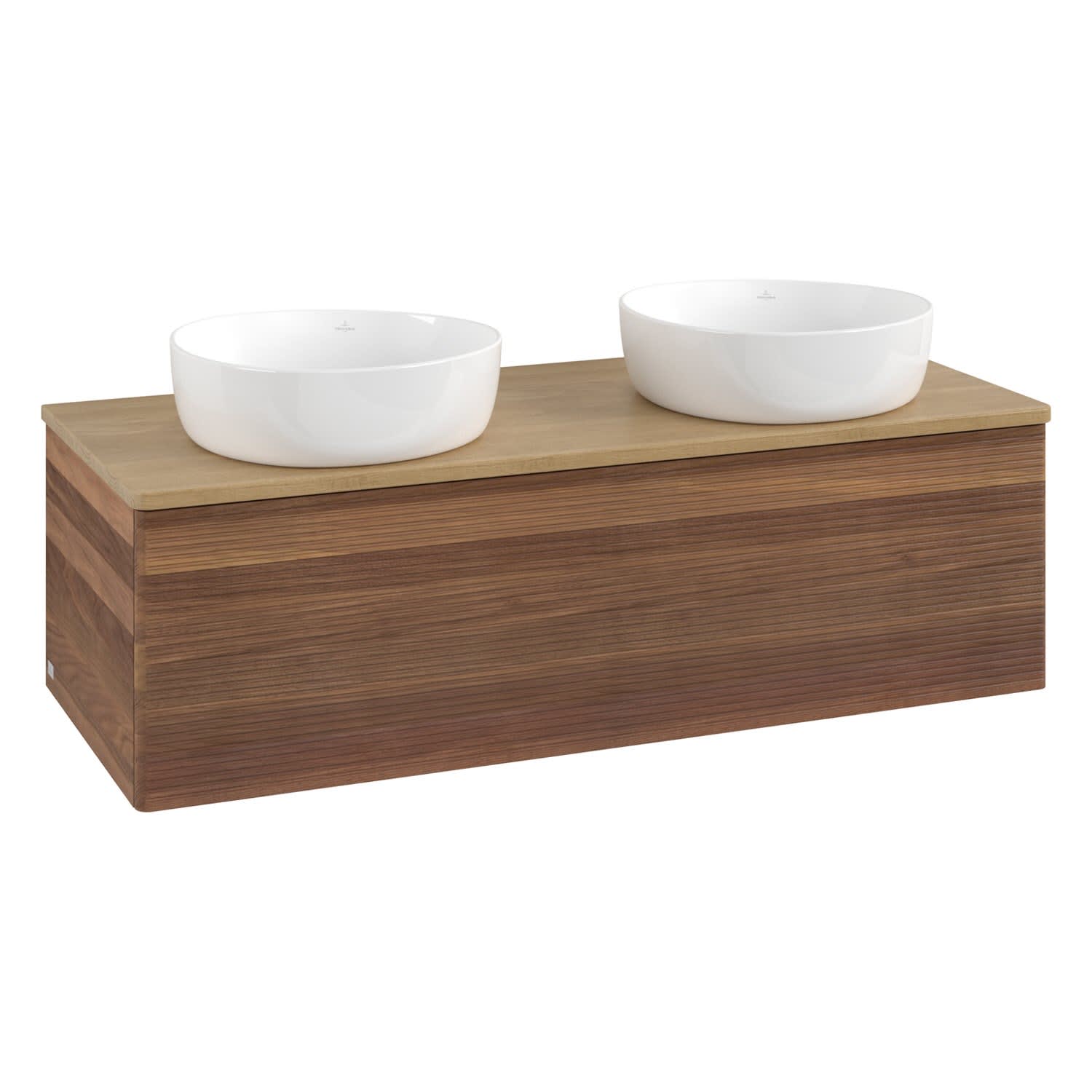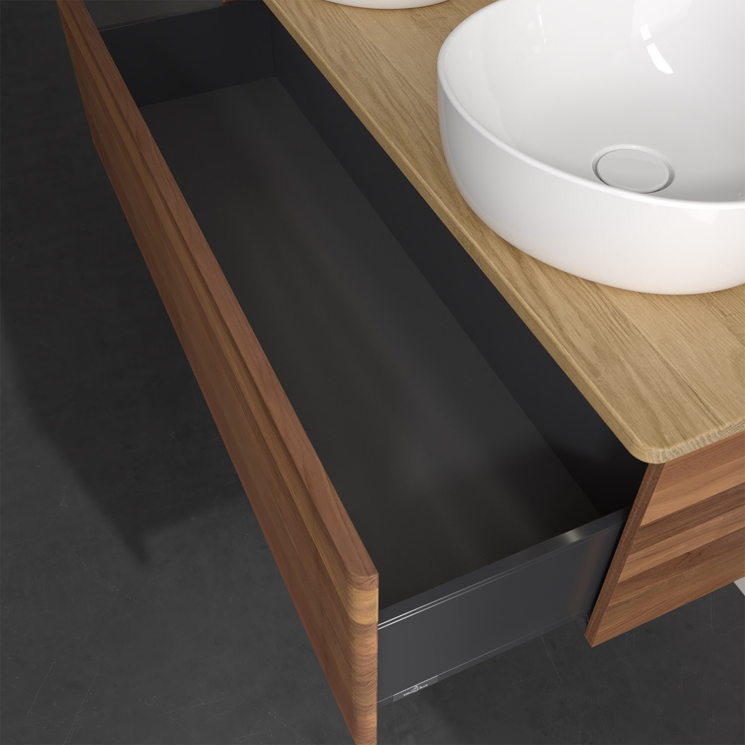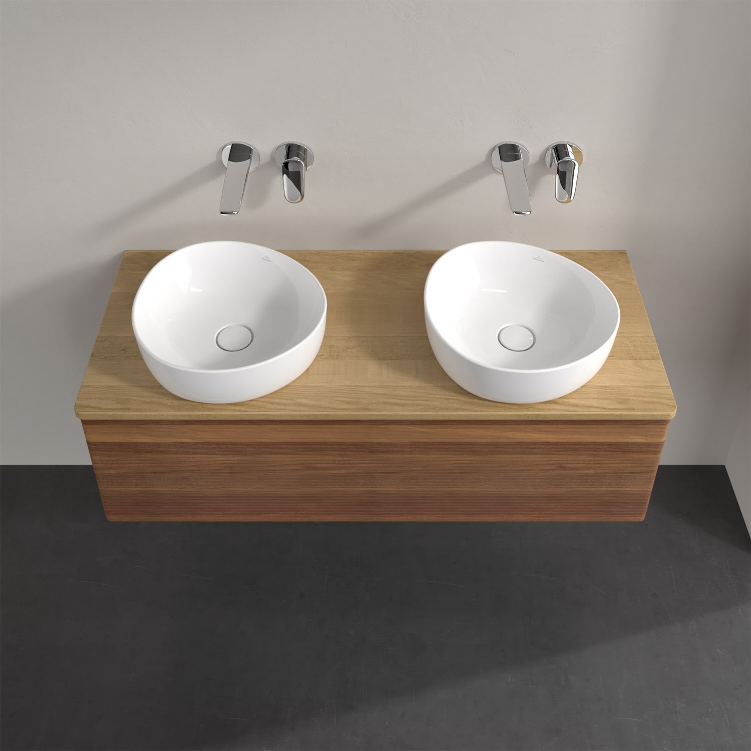 Der wandhängende Antao Waschtischunterschrank von Villeroy & Boch bietet nicht nur jede Menge Stauraum – er ist dank seines naturinspirierten Designs mit seinen abgerundeten Kanten auch noch besonders stilvoll und schafft eine gemütliche Atmosphäre im Badezimmer. Kombiniert mit zwei passenden Aufsatzwaschtischen also die ideale Wahl. Ein extra hoher Auszug bietet viel Platz, um alles Notwendige zu verstauen und Ordnung zu halten. Öffnen lässt er sich durch leichten Druck auf die strukturierte Front. Dabei aktiviert sich übrigens die Auszugsbeleuchtung in angenehmem Warmweiß. Dank Vollauszug hat man immer alles im Blick und der Antirutschboden verhindert ein Umfallen oder Verrutschen der Gegenstände. Einfach clever! Für eine besonders leichte Pflege sorgt die mehrschichtig deckend lackierte Oberfläche. Bei der Ausführung in Massivholz wird dank des verarbeiteten Massivholzes jedes Möbel zu einem Unikat, das sich durch das lebendige Naturmaterial durch seine einzigartige Struktur und Maserung auszeichnet.