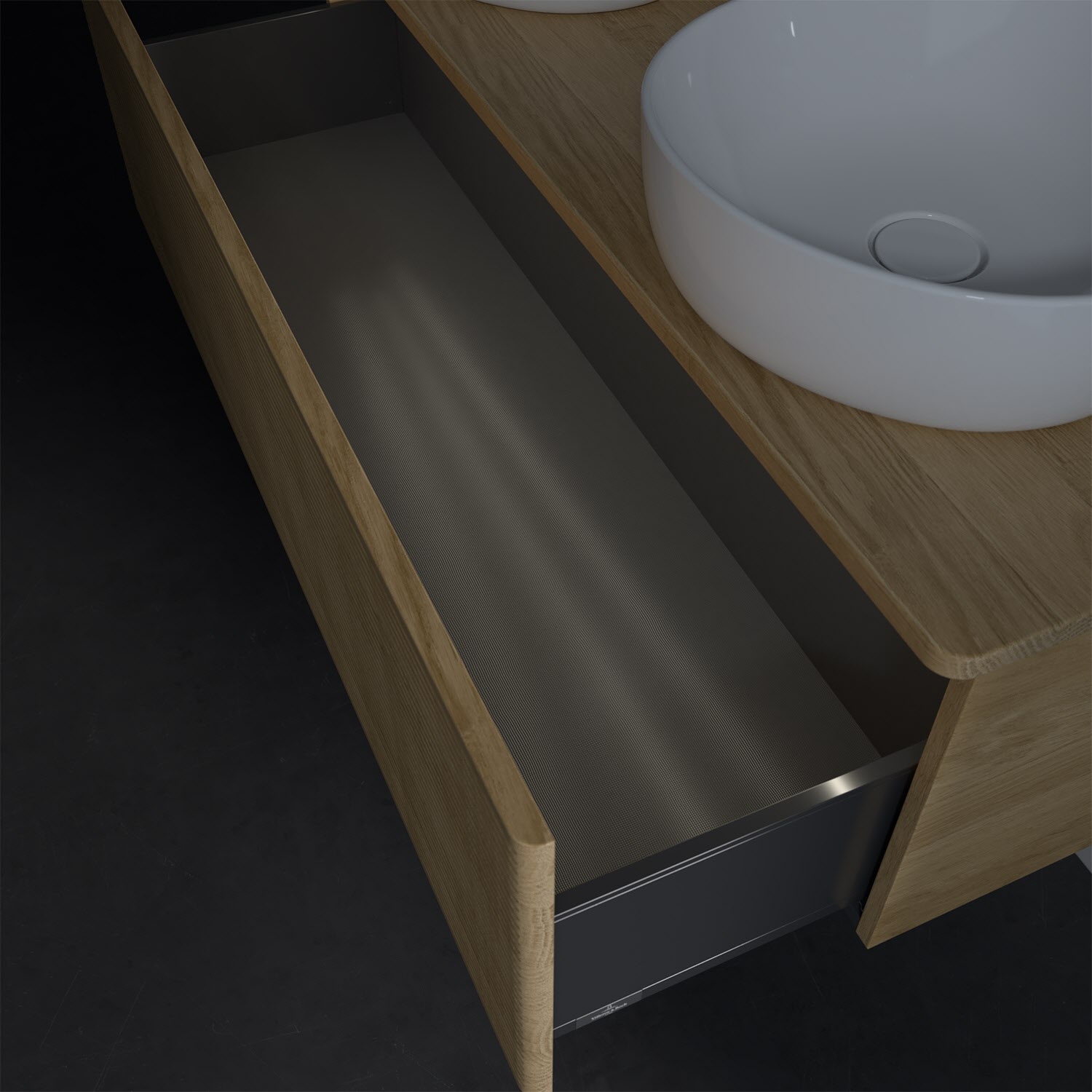 Der wandhängende Antao Waschtischunterschrank von Villeroy & Boch bietet nicht nur jede Menge Stauraum – er ist dank seines naturinspirierten Designs mit seinen abgerundeten Kanten auch noch besonders stilvoll und schafft eine gemütliche Atmosphäre im Badezimmer. Kombiniert mit zwei passenden Aufsatzwaschtischen also die ideale Wahl. Ein extra hoher Auszug bietet viel Platz, um alles Notwendige zu verstauen und Ordnung zu halten. Öffnen lässt er sich durch leichten Druck auf die strukturierte Front. Dabei aktiviert sich übrigens die Auszugsbeleuchtung in angenehmem Warmweiß. Dank Vollauszug hat man immer alles im Blick und der Antirutschboden verhindert ein Umfallen oder Verrutschen der Gegenstände. Einfach clever! Für eine besonders leichte Pflege sorgt die mehrschichtig deckend lackierte Oberfläche. Bei der Ausführung in Massivholz wird dank des verarbeiteten Massivholzes jedes Möbel zu einem Unikat, das sich durch das lebendige Naturmaterial durch seine einzigartige Struktur und Maserung auszeichnet.