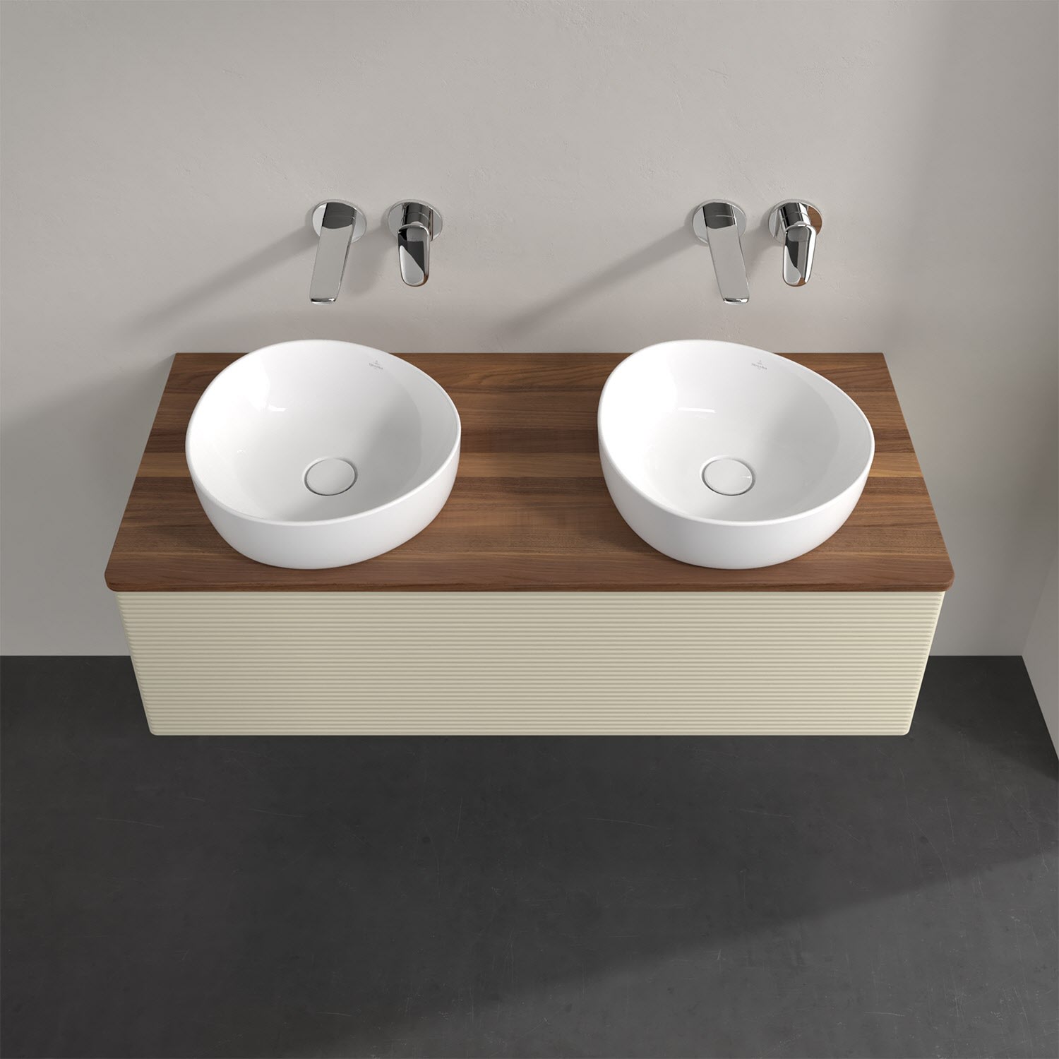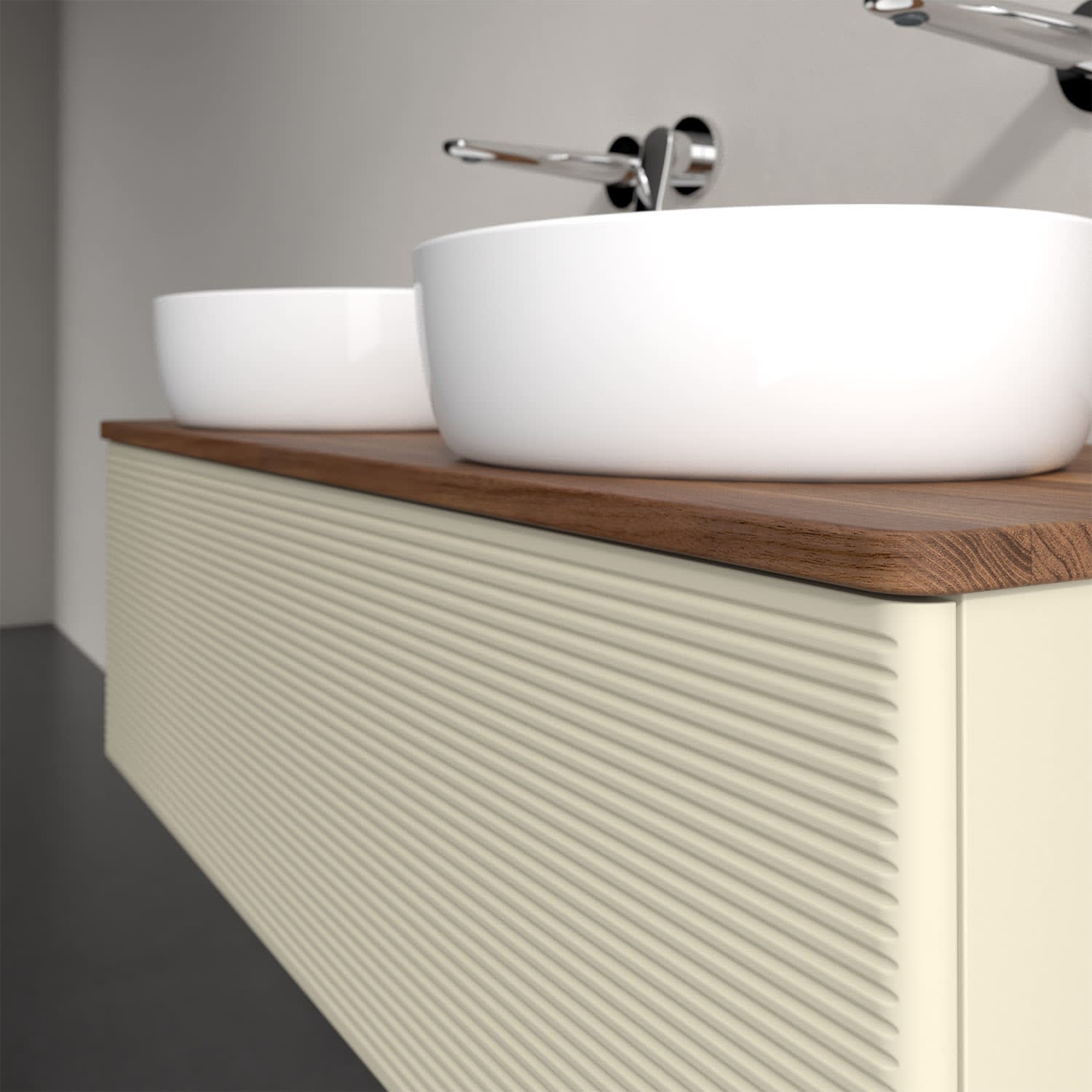 Der wandhängende Antao Waschtischunterschrank von Villeroy & Boch bietet nicht nur jede Menge Stauraum – er ist dank seines naturinspirierten Designs mit seinen abgerundeten Kanten auch noch besonders stilvoll und schafft eine gemütliche Atmosphäre im Badezimmer. Kombiniert mit zwei passenden Aufsatzwaschtischen also die ideale Wahl. Ein extra hoher Auszug bietet viel Platz, um alles Notwendige zu verstauen und Ordnung zu halten. Öffnen lässt er sich durch leichten Druck auf die strukturierte Front. Dabei aktiviert sich übrigens die Auszugsbeleuchtung in angenehmem Warmweiß. Dank Vollauszug hat man immer alles im Blick und der Antirutschboden verhindert ein Umfallen oder Verrutschen der Gegenstände. Einfach clever! Für eine besonders leichte Pflege sorgt die mehrschichtig deckend lackierte Oberfläche. Bei der Ausführung in Massivholz wird dank des verarbeiteten Massivholzes jedes Möbel zu einem Unikat, das sich durch das lebendige Naturmaterial durch seine einzigartige Struktur und Maserung auszeichnet.