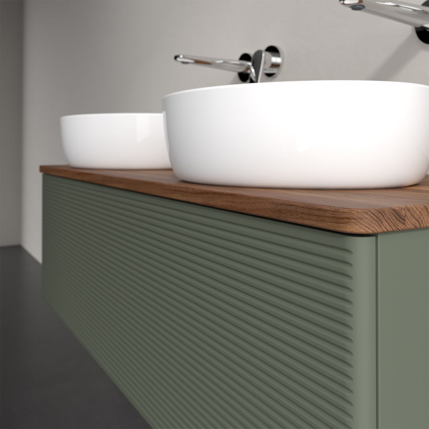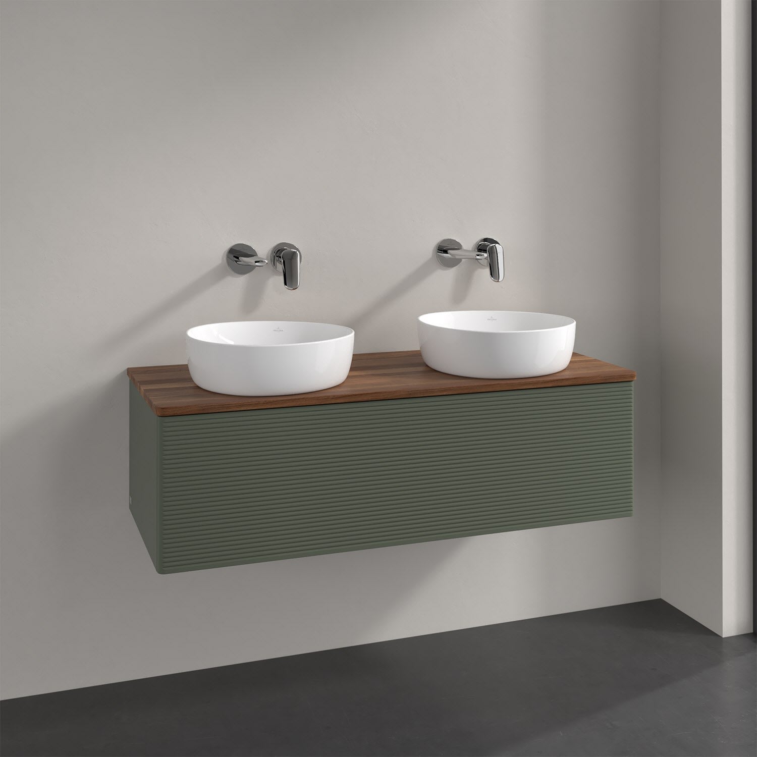 Der wandhängende Antao Waschtischunterschrank von Villeroy & Boch bietet nicht nur jede Menge Stauraum – er ist dank seines naturinspirierten Designs mit seinen abgerundeten Kanten auch noch besonders stilvoll und schafft eine gemütliche Atmosphäre im Badezimmer. Kombiniert mit zwei passenden Aufsatzwaschtischen also die ideale Wahl. Ein extra hoher Auszug bietet viel Platz, um alles Notwendige zu verstauen und Ordnung zu halten. Öffnen lässt er sich durch leichten Druck auf die strukturierte Front. Dabei aktiviert sich übrigens die Auszugsbeleuchtung in angenehmem Warmweiß. Dank Vollauszug hat man immer alles im Blick und der Antirutschboden verhindert ein Umfallen oder Verrutschen der Gegenstände. Einfach clever! Für eine besonders leichte Pflege sorgt die mehrschichtig deckend lackierte Oberfläche. Bei der Ausführung in Massivholz wird dank des verarbeiteten Massivholzes jedes Möbel zu einem Unikat, das sich durch das lebendige Naturmaterial durch seine einzigartige Struktur und Maserung auszeichnet.