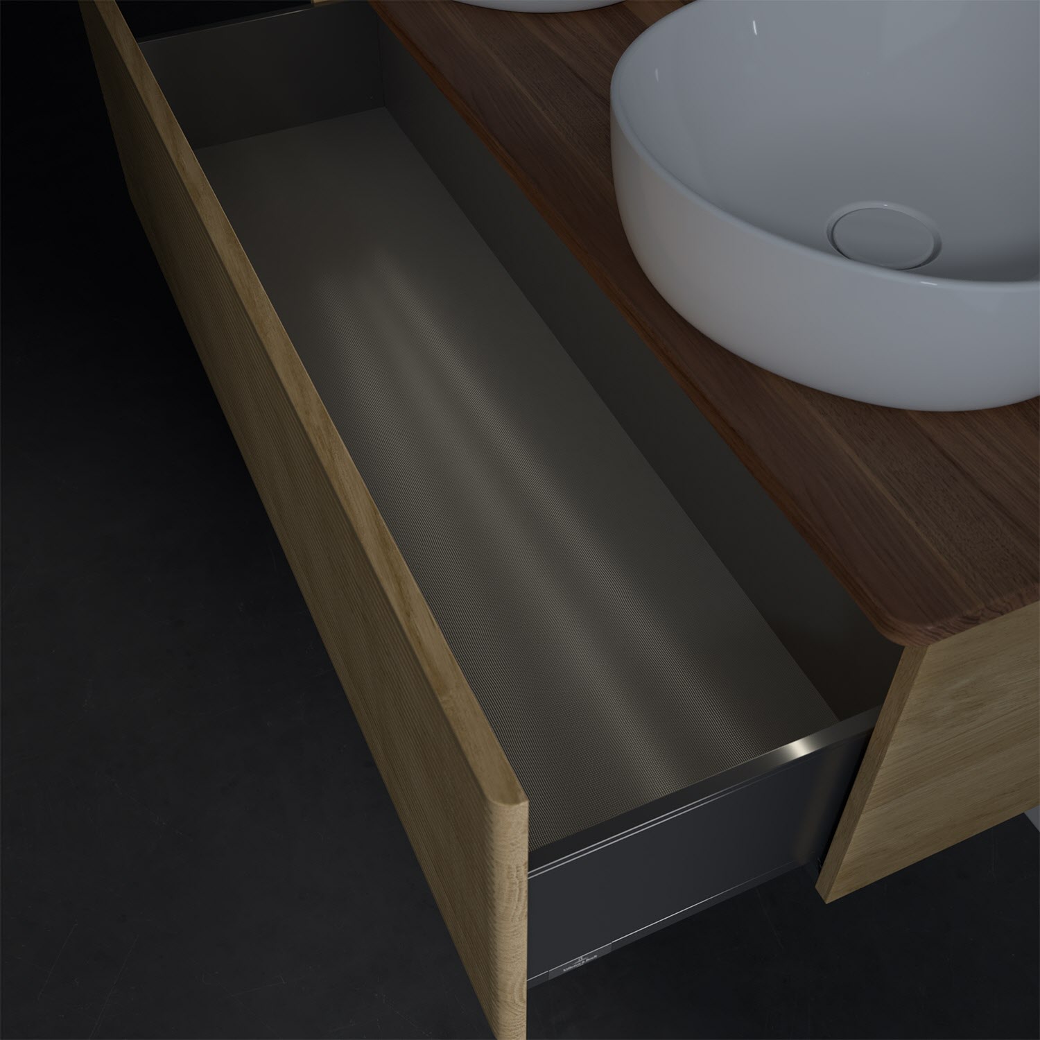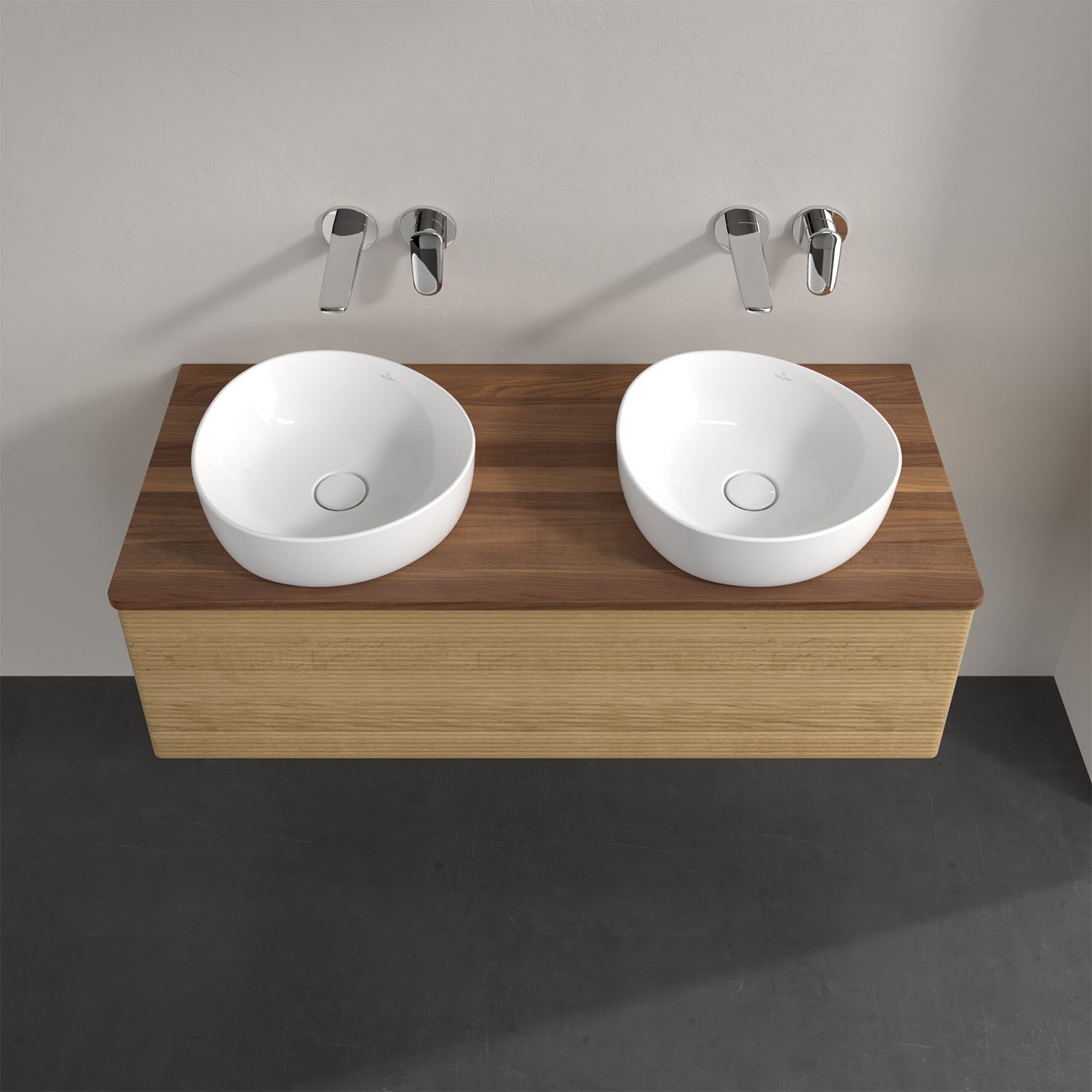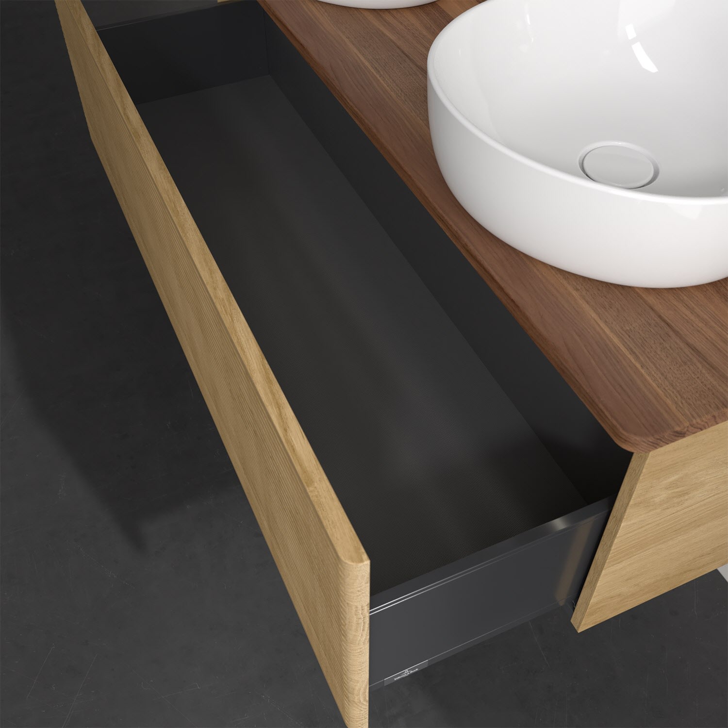Der wandhängende Antao Waschtischunterschrank von Villeroy & Boch bietet nicht nur jede Menge Stauraum – er ist dank seines naturinspirierten Designs mit seinen abgerundeten Kanten auch noch besonders stilvoll und schafft eine gemütliche Atmosphäre im Badezimmer. Kombiniert mit zwei passenden Aufsatzwaschtischen also die ideale Wahl. Ein extra hoher Auszug bietet viel Platz, um alles Notwendige zu verstauen und Ordnung zu halten. Öffnen lässt er sich durch leichten Druck auf die strukturierte Front. Dabei aktiviert sich übrigens die Auszugsbeleuchtung in angenehmem Warmweiß. Dank Vollauszug hat man immer alles im Blick und der Antirutschboden verhindert ein Umfallen oder Verrutschen der Gegenstände. Einfach clever! Für eine besonders leichte Pflege sorgt die mehrschichtig deckend lackierte Oberfläche. Bei der Ausführung in Massivholz wird dank des verarbeiteten Massivholzes jedes Möbel zu einem Unikat, das sich durch das lebendige Naturmaterial durch seine einzigartige Struktur und Maserung auszeichnet.