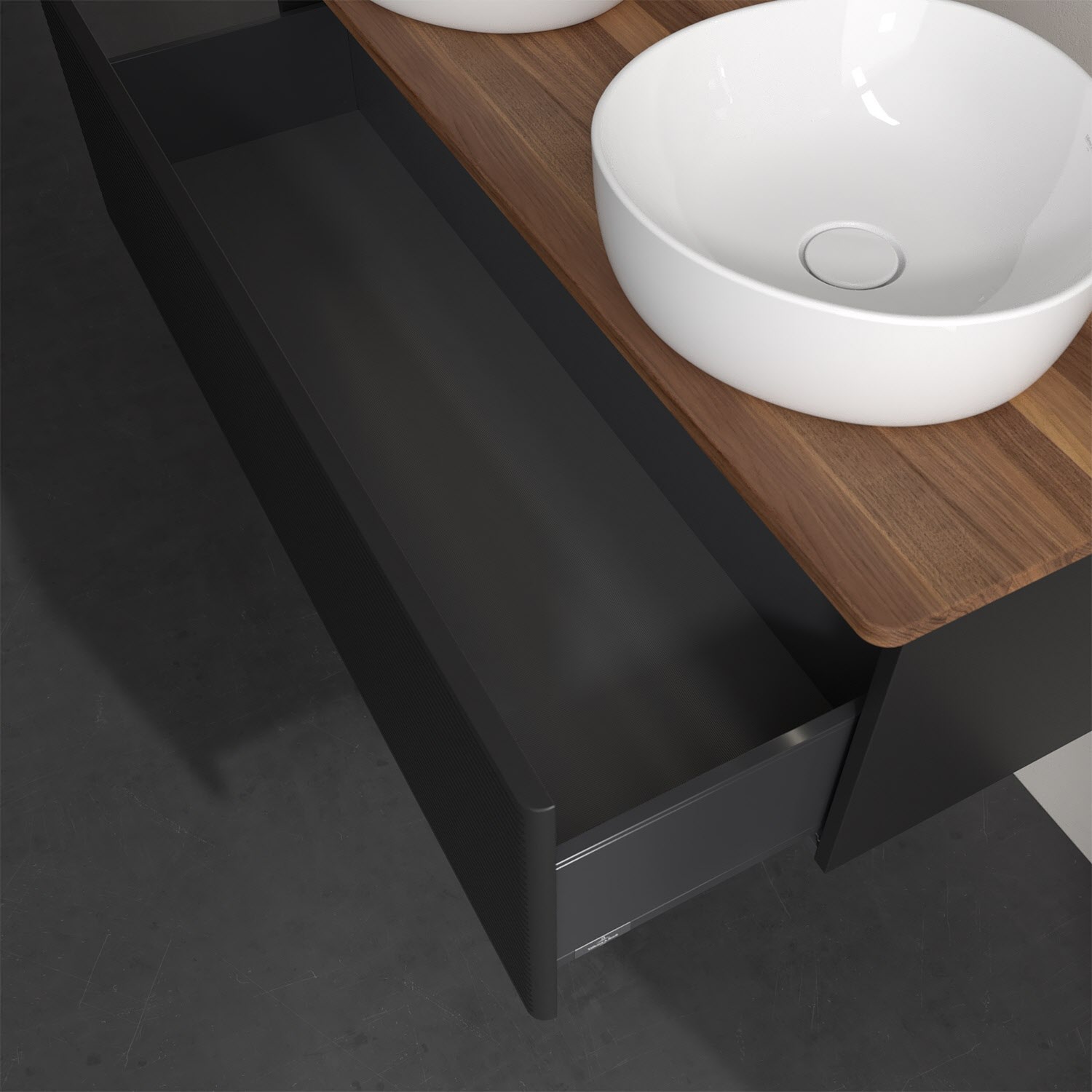 Der wandhängende Antao Waschtischunterschrank von Villeroy & Boch bietet nicht nur jede Menge Stauraum – er ist dank seines naturinspirierten Designs mit seinen abgerundeten Kanten auch noch besonders stilvoll und schafft eine gemütliche Atmosphäre im Badezimmer. Kombiniert mit zwei passenden Aufsatzwaschtischen also die ideale Wahl. Ein extra hoher Auszug bietet viel Platz, um alles Notwendige zu verstauen und Ordnung zu halten. Öffnen lässt er sich durch leichten Druck auf die strukturierte Front. Dabei aktiviert sich übrigens die Auszugsbeleuchtung in angenehmem Warmweiß. Dank Vollauszug hat man immer alles im Blick und der Antirutschboden verhindert ein Umfallen oder Verrutschen der Gegenstände. Einfach clever! Für eine besonders leichte Pflege sorgt die mehrschichtig deckend lackierte Oberfläche. Bei der Ausführung in Massivholz wird dank des verarbeiteten Massivholzes jedes Möbel zu einem Unikat, das sich durch das lebendige Naturmaterial durch seine einzigartige Struktur und Maserung auszeichnet.