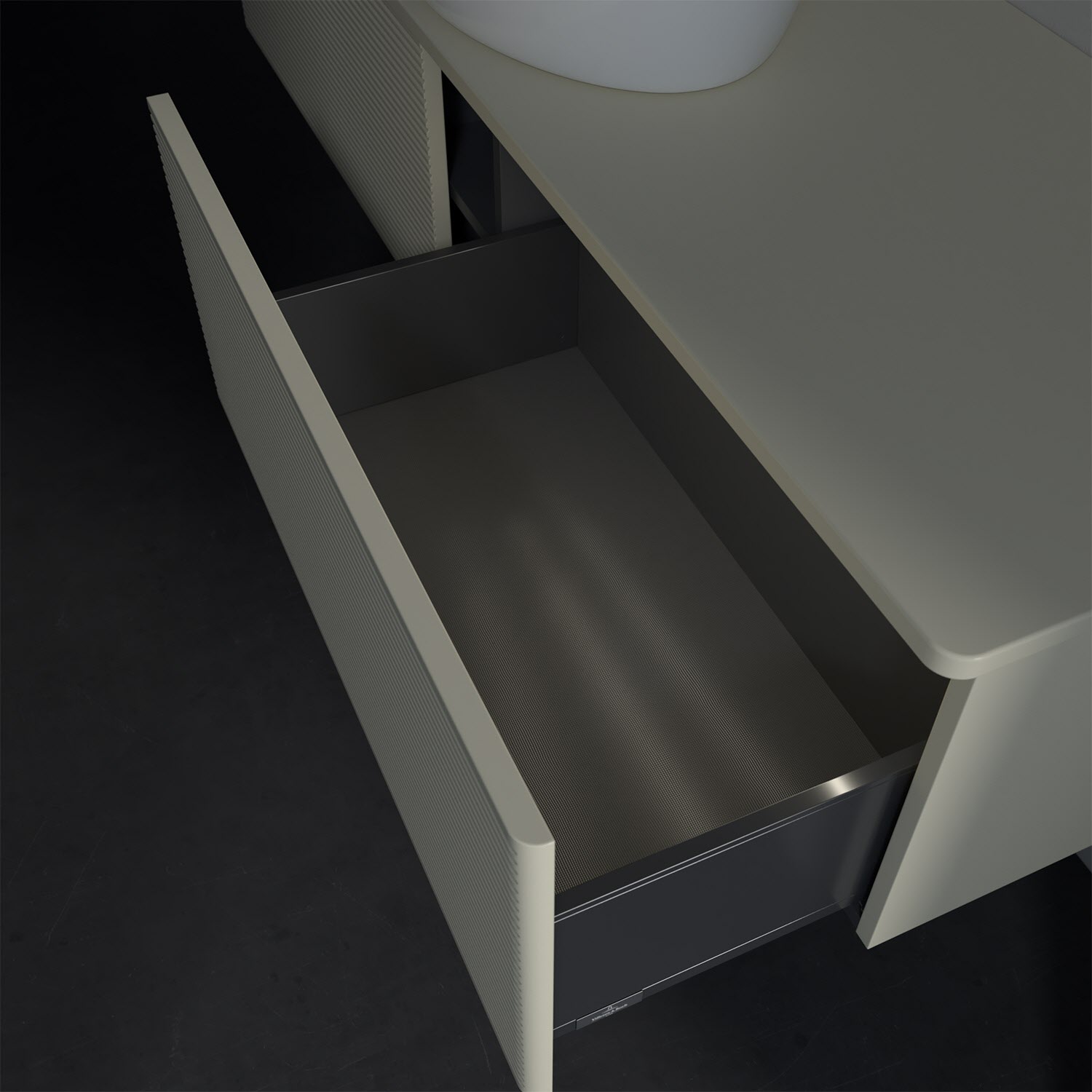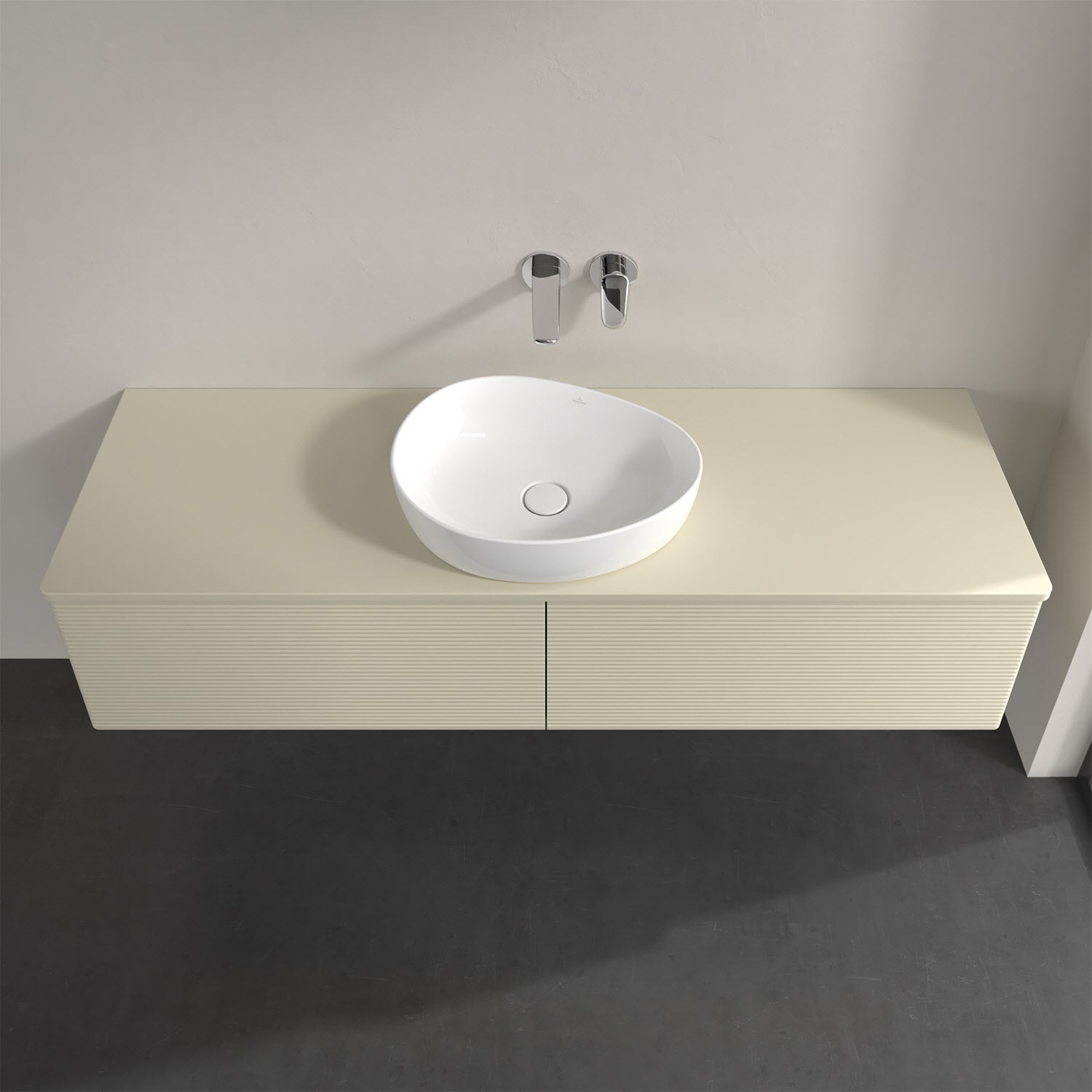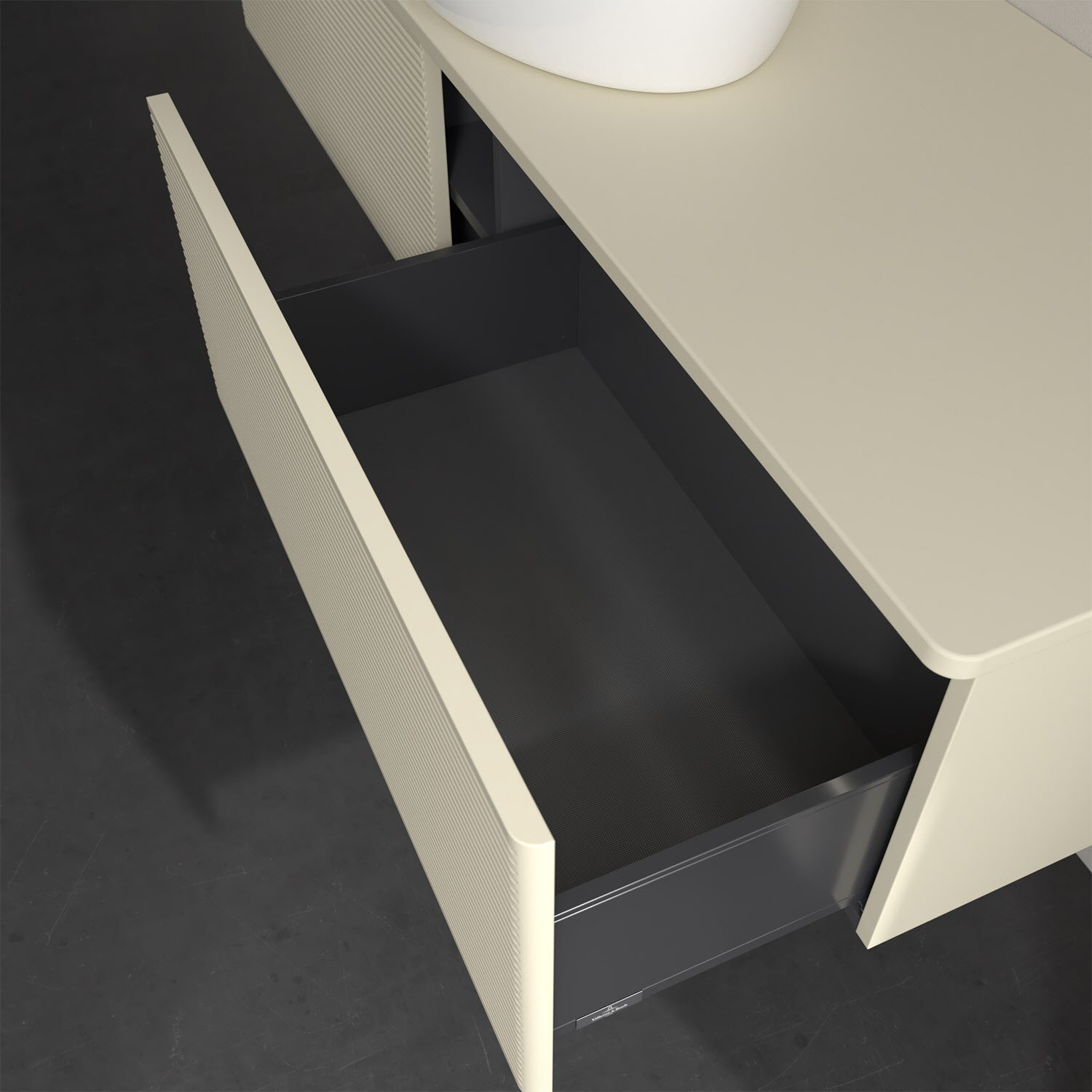 Der wandhängende Antao Waschtischunterschrank bietet mit seinen beiden extra hohen Auszügen und seiner erstaunlichen Größe viel Platz zum Verstauen von Utensilien im Badezimmer. Dank des mittig platzierten Aufsatzwaschtischs gibt es seitlich weiteren Platz für Handtücher, Seifenspender & Co. auf der Waschtischplatte. Inspiriert von der Natur überzeugt der Unterschrank auch optisch mit sanfter Formsprache und abgerundete Kanten. Die grifflosen Auszüge mit strukturierter Front sind mit der Push-to-Open Funktion ausgestattet und verfügen über einen Antirutschboden, damit Utensilien sicher verstaut werden können. Den Überblick behält man dank der warmweißen Auszugsbeleuchtung, die sich automatisch beim Öffnen einschaltet. Mit seiner Vollauszug- und Selbsteinzug-Funktion ist der Schrank einfach praktisch und leicht zu bedienen. Qualität von Villeroy & Boch! Für eine besonders leichte Pflege sorgt die mehrschichtig deckend lackierte Oberfläche.
