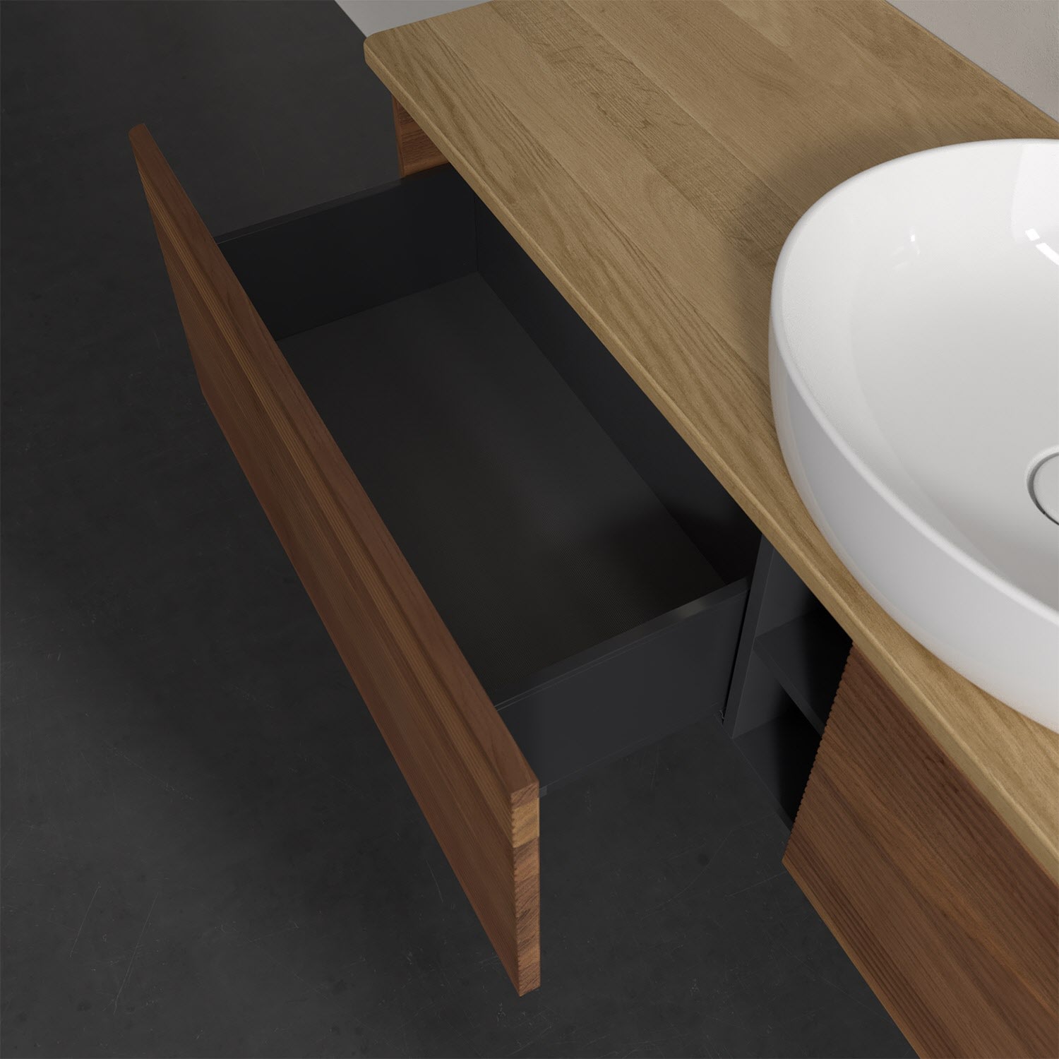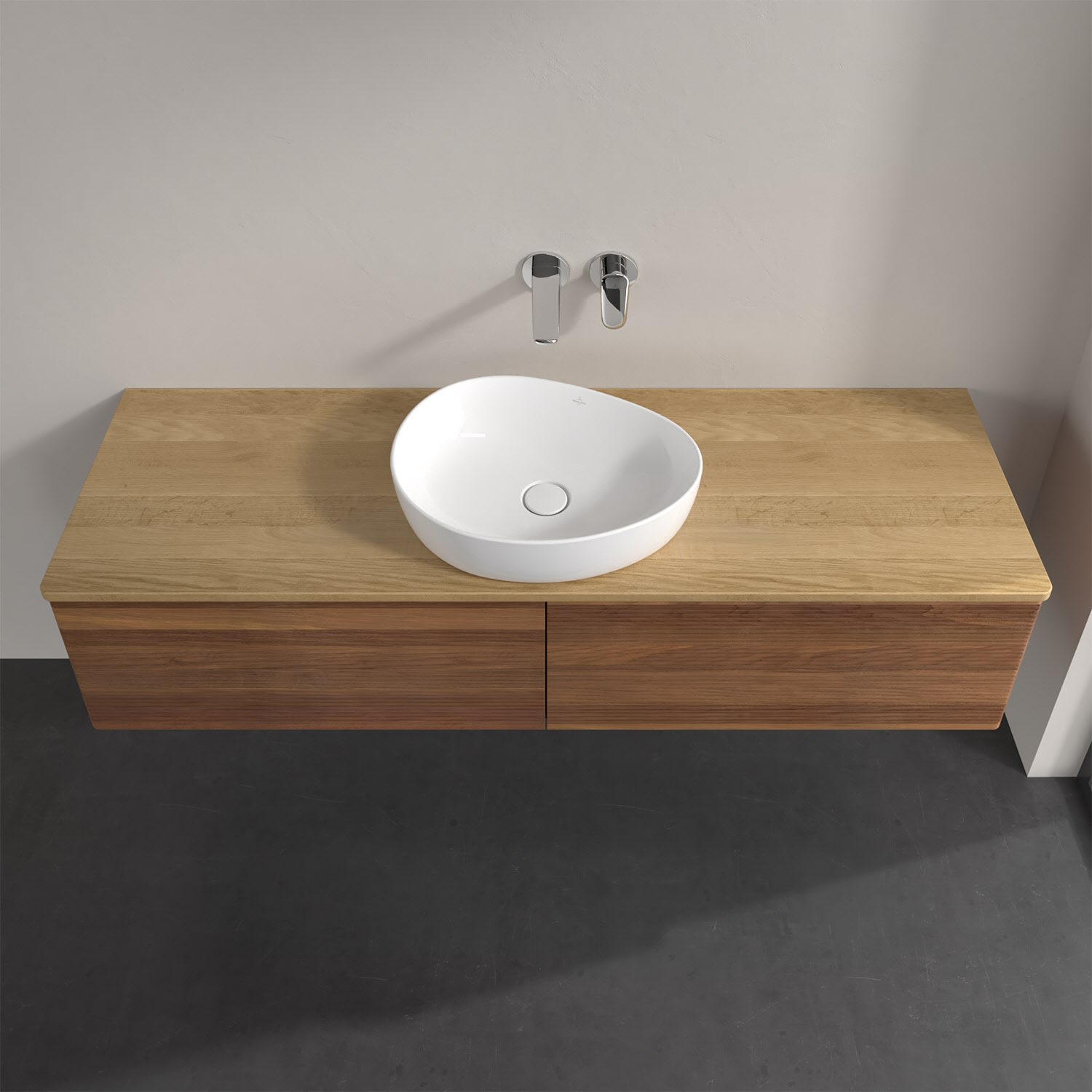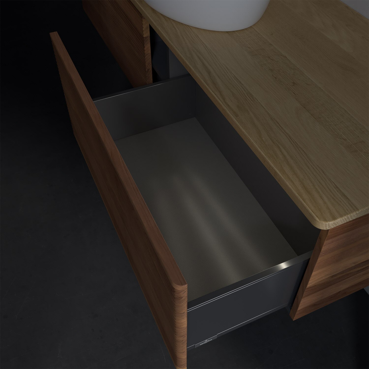 Der wandhängende Antao Waschtischunterschrank bietet mit seinen beiden extra hohen Auszügen und seiner erstaunlichen Größe viel Platz zum Verstauen von Utensilien im Badezimmer. Dank des mittig platzierten Aufsatzwaschtischs gibt es seitlich weiteren Platz für Handtücher, Seifenspender & Co. auf der Waschtischplatte. Inspiriert von der Natur überzeugt der Unterschrank auch optisch mit sanfter Formsprache und abgerundete Kanten. Die grifflosen Auszüge mit strukturierter Front sind mit der Push-to-Open Funktion ausgestattet und verfügen über einen Antirutschboden, damit Utensilien sicher verstaut werden können. Den Überblick behält man dank der warmweißen Auszugsbeleuchtung, die sich automatisch beim Öffnen einschaltet. Mit seiner Vollauszug- und Selbsteinzug-Funktion ist der Schrank einfach praktisch und leicht zu bedienen. Qualität von Villeroy & Boch! Für eine besonders leichte Pflege sorgt die mehrschichtig deckend lackierte Oberfläche. Bei der Ausführung in Massivholz wird dank des verarbeiteten Massivholzes jedes Möbel zu einem Unikat, das sich durch das lebendige Naturmaterial durch seine einzigartige Struktur und Maserung auszeichnet.