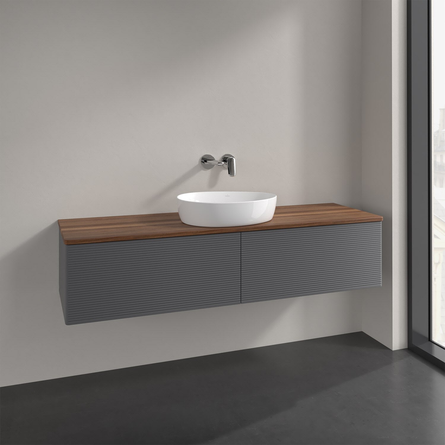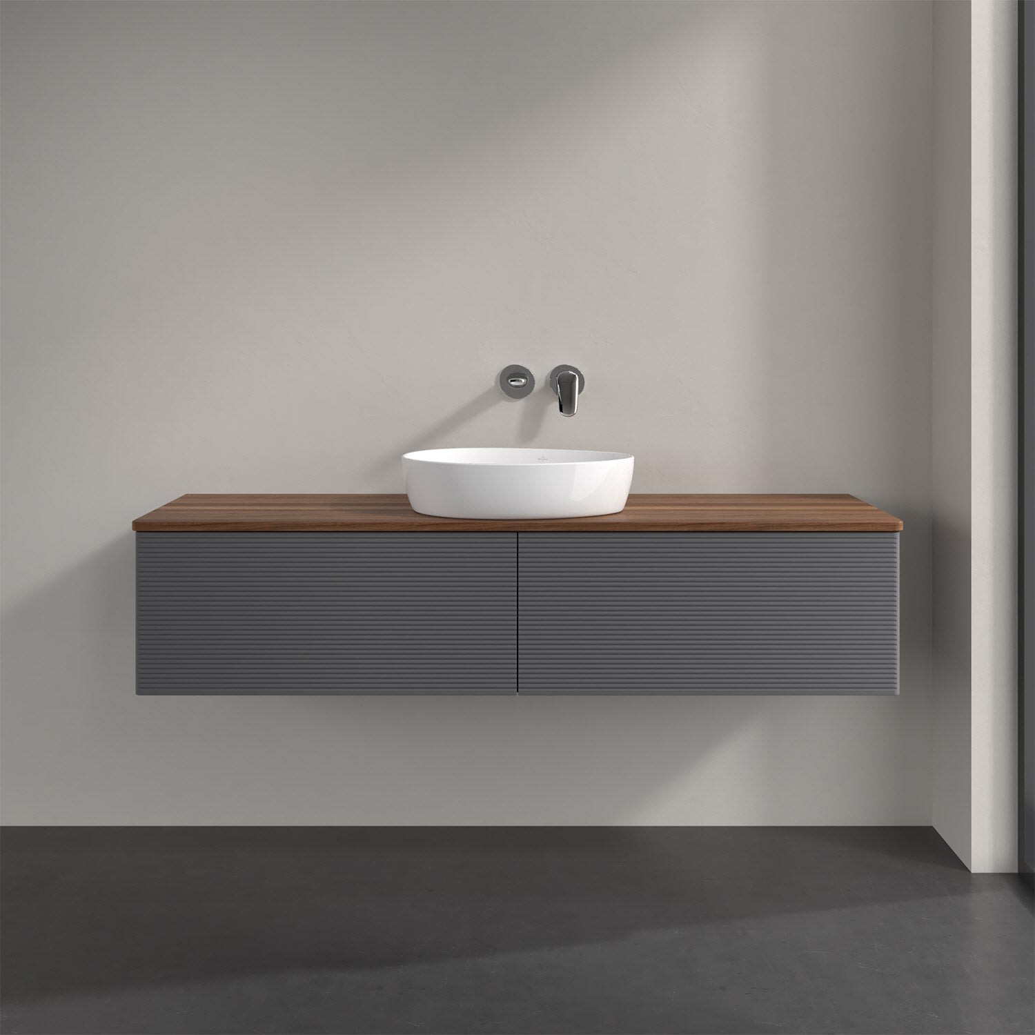Villeroy & Boch Antao Waschbeckenunterschrank, 160 x 36 cm, 2 Auszüge mit LED-Licht, Front mit Struktur, ohne Hahnloch, für Waschtisch mittig