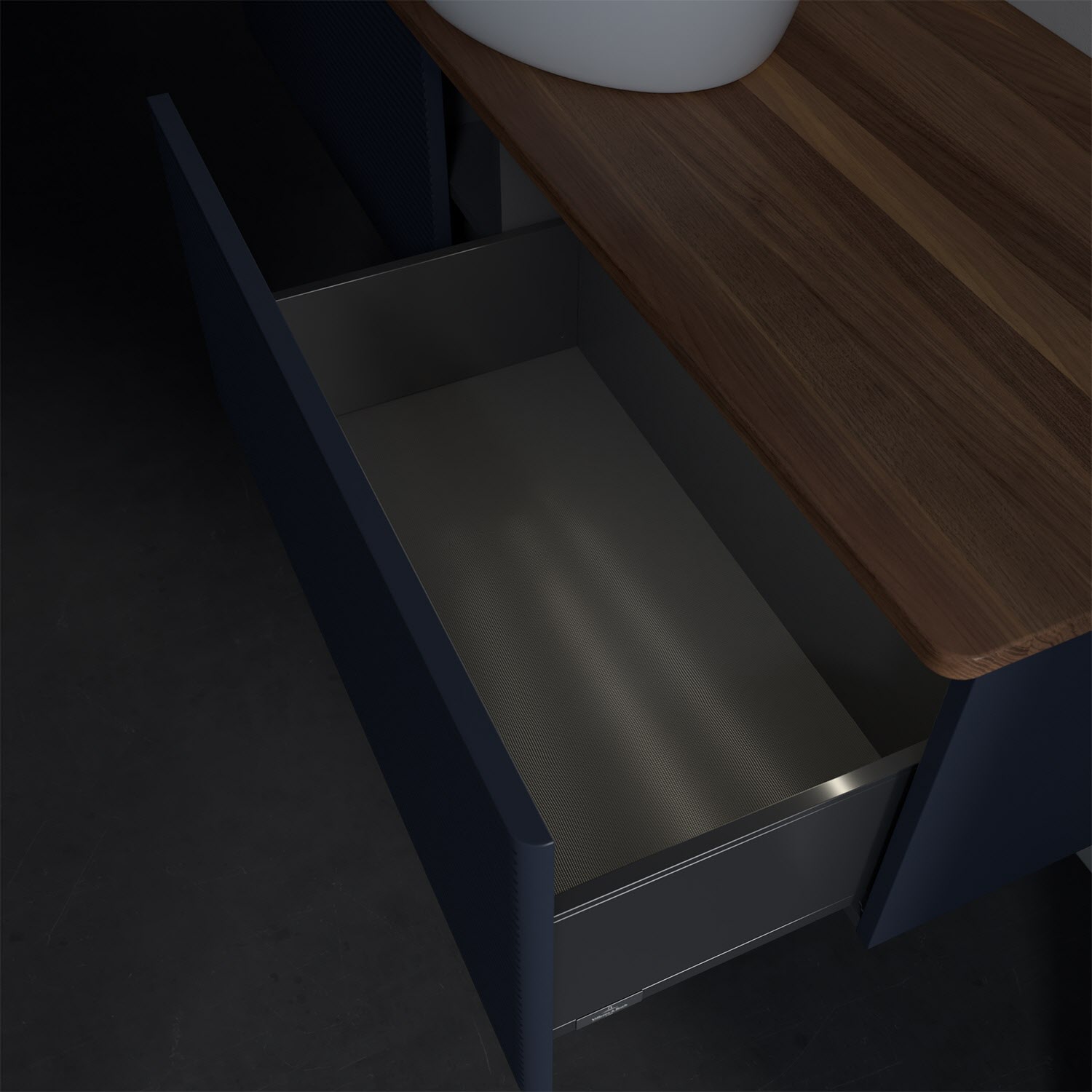 Der wandhängende Antao Waschtischunterschrank bietet mit seinen beiden extra hohen Auszügen und seiner erstaunlichen Größe viel Platz zum Verstauen von Utensilien im Badezimmer. Dank des mittig platzierten Aufsatzwaschtischs gibt es seitlich weiteren Platz für Handtücher, Seifenspender & Co. auf der Waschtischplatte. Inspiriert von der Natur überzeugt der Unterschrank auch optisch mit sanfter Formsprache und abgerundete Kanten. Die grifflosen Auszüge mit strukturierter Front sind mit der Push-to-Open Funktion ausgestattet und verfügen über einen Antirutschboden, damit Utensilien sicher verstaut werden können. Den Überblick behält man dank der warmweißen Auszugsbeleuchtung, die sich automatisch beim Öffnen einschaltet. Mit seiner Vollauszug- und Selbsteinzug-Funktion ist der Schrank einfach praktisch und leicht zu bedienen. Qualität von Villeroy & Boch! Für eine besonders leichte Pflege sorgt die mehrschichtig deckend lackierte Oberfläche. Bei der Ausführung in Massivholz wird dank des verarbeiteten Massivholzes jedes Möbel zu einem Unikat, das sich durch das lebendige Naturmaterial durch seine einzigartige Struktur und Maserung auszeichnet.