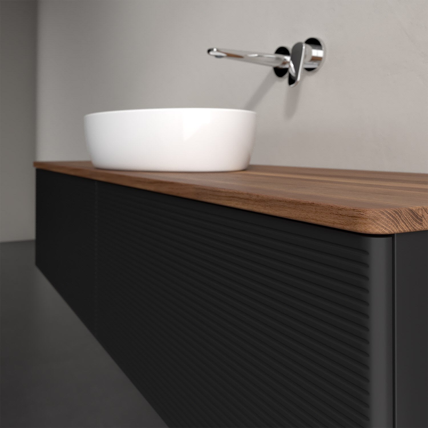 Der wandhängende Antao Waschtischunterschrank bietet mit seinen beiden extra hohen Auszügen und seiner erstaunlichen Größe viel Platz zum Verstauen von Utensilien im Badezimmer. Dank des mittig platzierten Aufsatzwaschtischs gibt es seitlich weiteren Platz für Handtücher, Seifenspender & Co. auf der Waschtischplatte. Inspiriert von der Natur überzeugt der Unterschrank auch optisch mit sanfter Formsprache und abgerundete Kanten. Die grifflosen Auszüge mit strukturierter Front sind mit der Push-to-Open Funktion ausgestattet und verfügen über einen Antirutschboden, damit Utensilien sicher verstaut werden können. Den Überblick behält man dank der warmweißen Auszugsbeleuchtung, die sich automatisch beim Öffnen einschaltet. Mit seiner Vollauszug- und Selbsteinzug-Funktion ist der Schrank einfach praktisch und leicht zu bedienen. Qualität von Villeroy & Boch! Für eine besonders leichte Pflege sorgt die mehrschichtig deckend lackierte Oberfläche. Bei der Ausführung in Massivholz wird dank des verarbeiteten Massivholzes jedes Möbel zu einem Unikat, das sich durch das lebendige Naturmaterial durch seine einzigartige Struktur und Maserung auszeichnet.