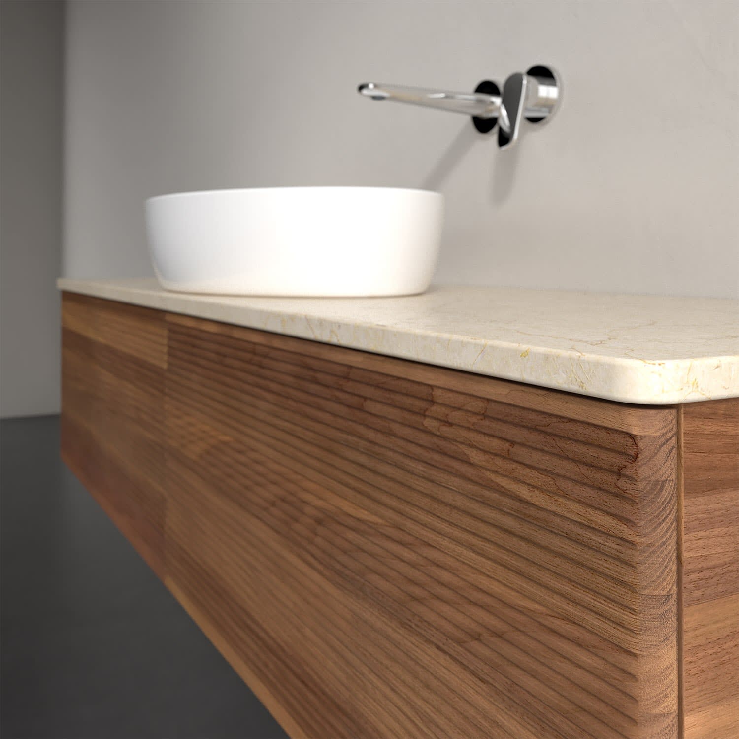 Der wandhängende Antao Waschtischunterschrank bietet mit seinen beiden extra hohen Auszügen und seiner erstaunlichen Größe viel Platz zum Verstauen von Utensilien im Badezimmer. Dank des mittig platzierten Aufsatzwaschtischs gibt es seitlich weiteren Platz für Handtücher, Seifenspender & Co. auf der Waschtischplatte. Inspiriert von der Natur überzeugt der Unterschrank auch optisch mit sanfter Formsprache und abgerundete Kanten. Die grifflosen Auszüge mit strukturierter Front sind mit der Push-to-Open Funktion ausgestattet und verfügen über einen Antirutschboden, damit Utensilien sicher verstaut werden können. Den Überblick behält man dank der warmweißen Auszugsbeleuchtung, die sich automatisch beim Öffnen einschaltet. Mit seiner Vollauszug- und Selbsteinzug-Funktion ist der Schrank einfach praktisch und leicht zu bedienen. Qualität von Villeroy & Boch! Für eine besonders leichte Pflege sorgt die mehrschichtig deckend lackierte Oberfläche. Bei der Ausführung in Massivholz wird dank des verarbeiteten Massivholzes jedes Möbel zu einem Unikat, das sich durch das lebendige Naturmaterial durch seine einzigartige Struktur und Maserung auszeichnet.