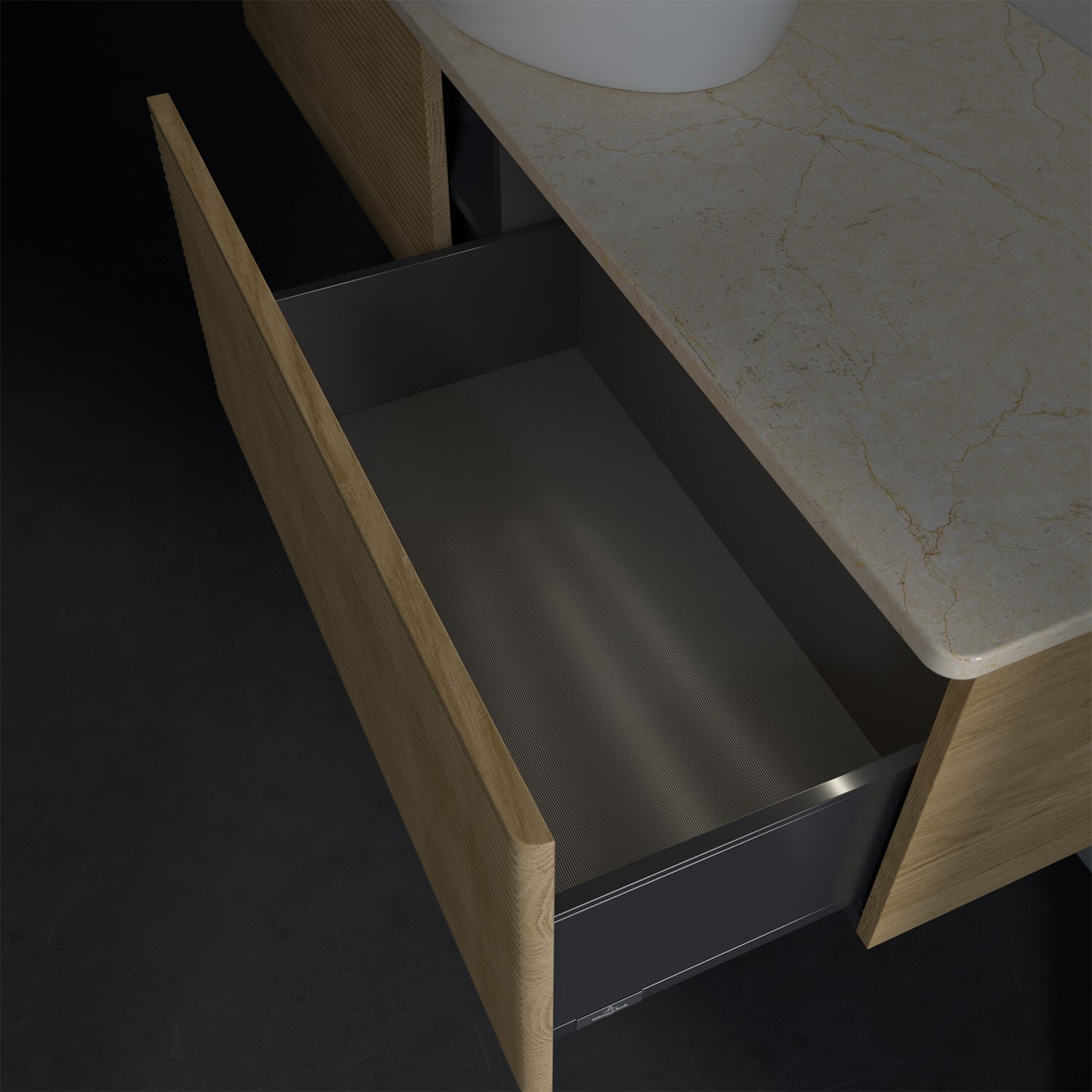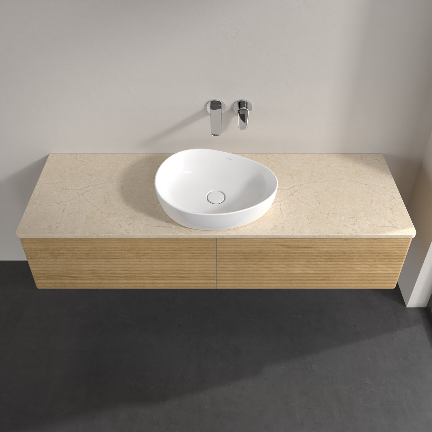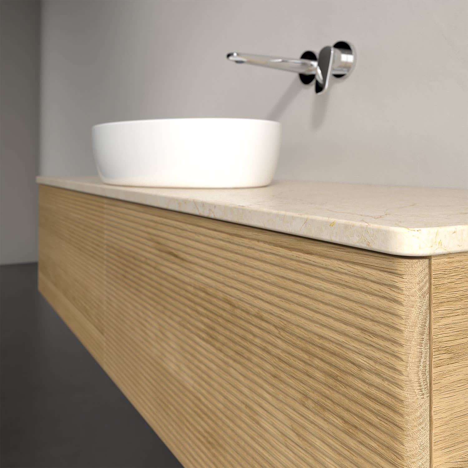 Der wandhängende Antao Waschtischunterschrank bietet mit seinen beiden extra hohen Auszügen und seiner erstaunlichen Größe viel Platz zum Verstauen von Utensilien im Badezimmer. Dank des mittig platzierten Aufsatzwaschtischs gibt es seitlich weiteren Platz für Handtücher, Seifenspender & Co. auf der Waschtischplatte. Inspiriert von der Natur überzeugt der Unterschrank auch optisch mit sanfter Formsprache und abgerundete Kanten. Die grifflosen Auszüge mit strukturierter Front sind mit der Push-to-Open Funktion ausgestattet und verfügen über einen Antirutschboden, damit Utensilien sicher verstaut werden können. Den Überblick behält man dank der warmweißen Auszugsbeleuchtung, die sich automatisch beim Öffnen einschaltet. Mit seiner Vollauszug- und Selbsteinzug-Funktion ist der Schrank einfach praktisch und leicht zu bedienen. Qualität von Villeroy & Boch! Für eine besonders leichte Pflege sorgt die mehrschichtig deckend lackierte Oberfläche. Bei der Ausführung in Massivholz wird dank des verarbeiteten Massivholzes jedes Möbel zu einem Unikat, das sich durch das lebendige Naturmaterial durch seine einzigartige Struktur und Maserung auszeichnet.