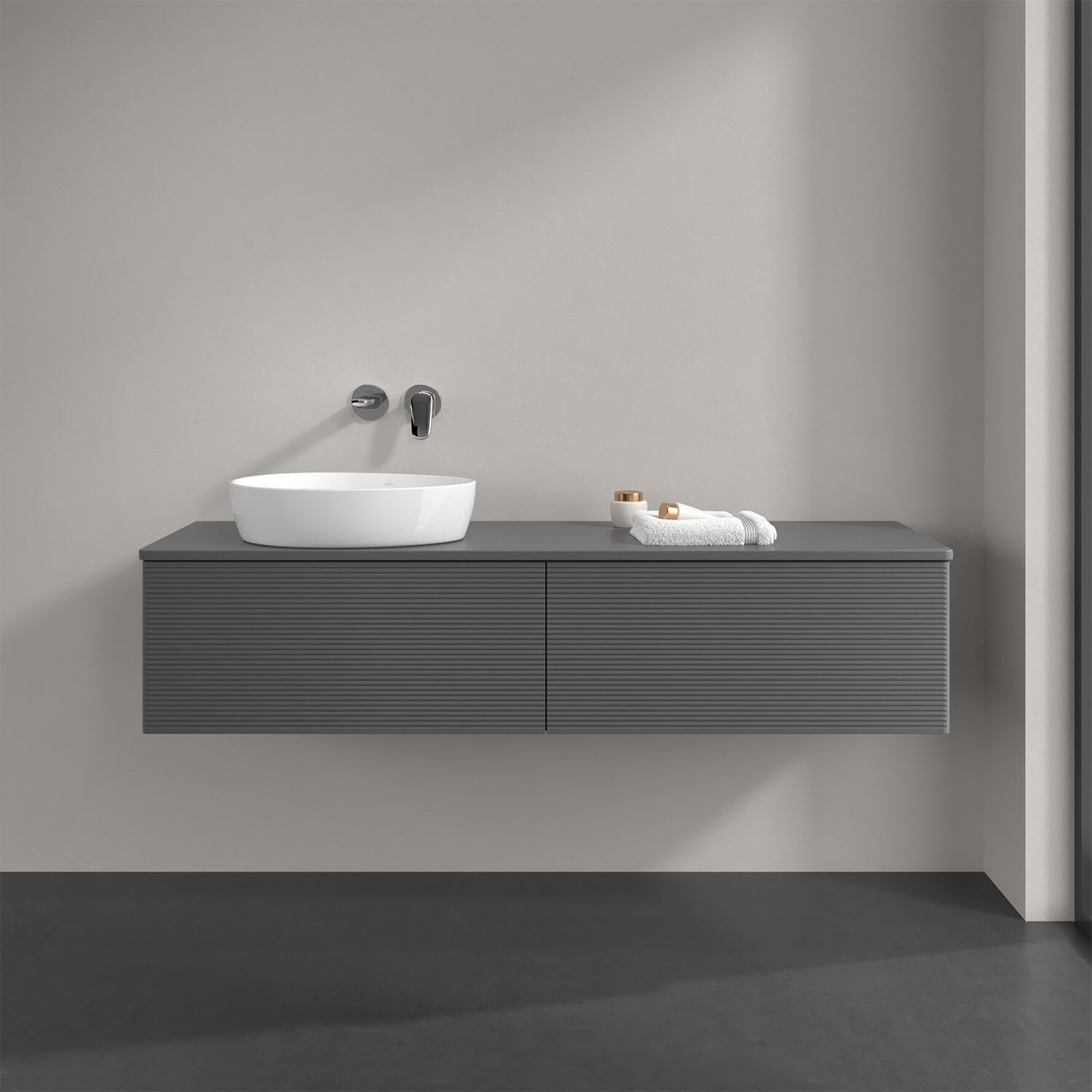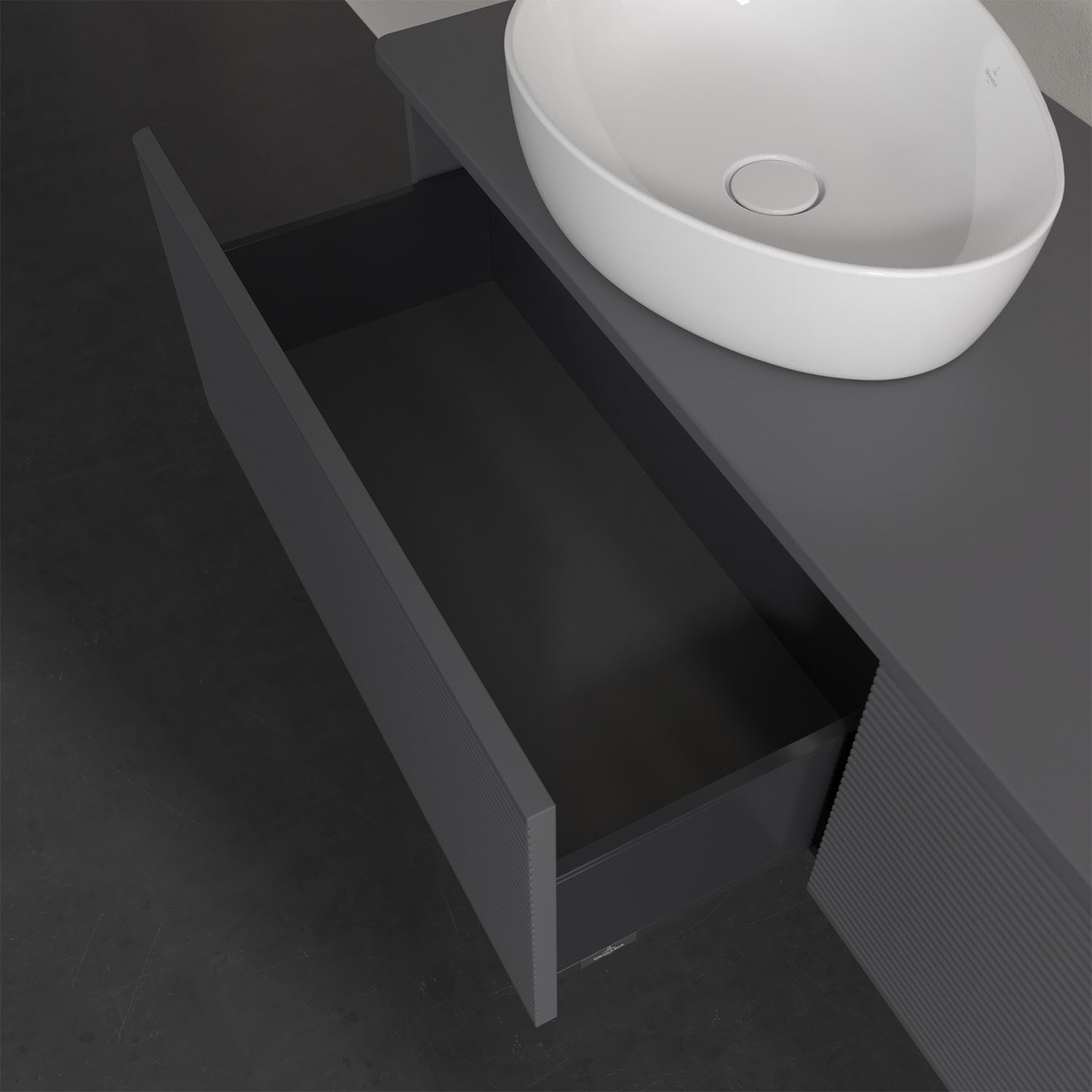 Der wandhängende Antao Waschtischunterschrank bietet mit seinen beiden extra hohen Auszügen und seiner erstaunlichen Größe viel Platz zum Verstauen von Utensilien im Badezimmer. Dank des seitlich platzierten Aufsatzwaschtischs gibt es daneben weiteren Platz für Handtücher, Seifenspender & Co. auf der Waschtischplatte. Inspiriert von der Natur überzeugt der Unterschrank auch optisch mit sanfter Formsprache und abgerundete Kanten. Die grifflosen Auszüge mit strukturierter Front sind mit der Push-to-Open Funktion ausgestattet und verfügen über einen Antirutschboden, damit Utensilien sicher verstaut werden können. Den Überblick behält man dank der warmweißen Auszugsbeleuchtung, die sich automatisch beim Öffnen einschaltet. Mit seiner Vollauszug- und Selbsteinzug-Funktion ist der Schrank einfach praktisch und leicht zu bedienen. Qualität von Villeroy & Boch! Für eine besonders leichte Pflege sorgt die mehrschichtig deckend lackierte Oberfläche.