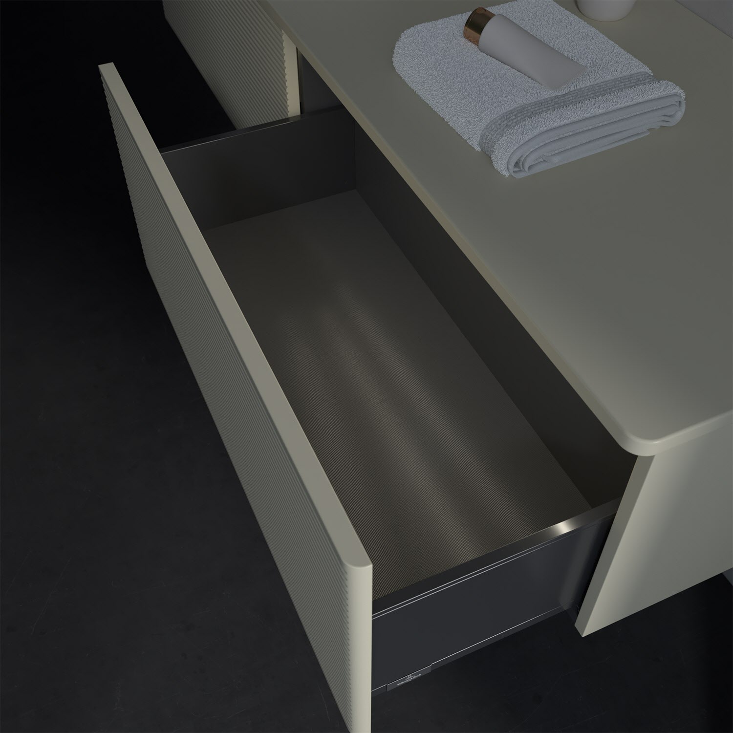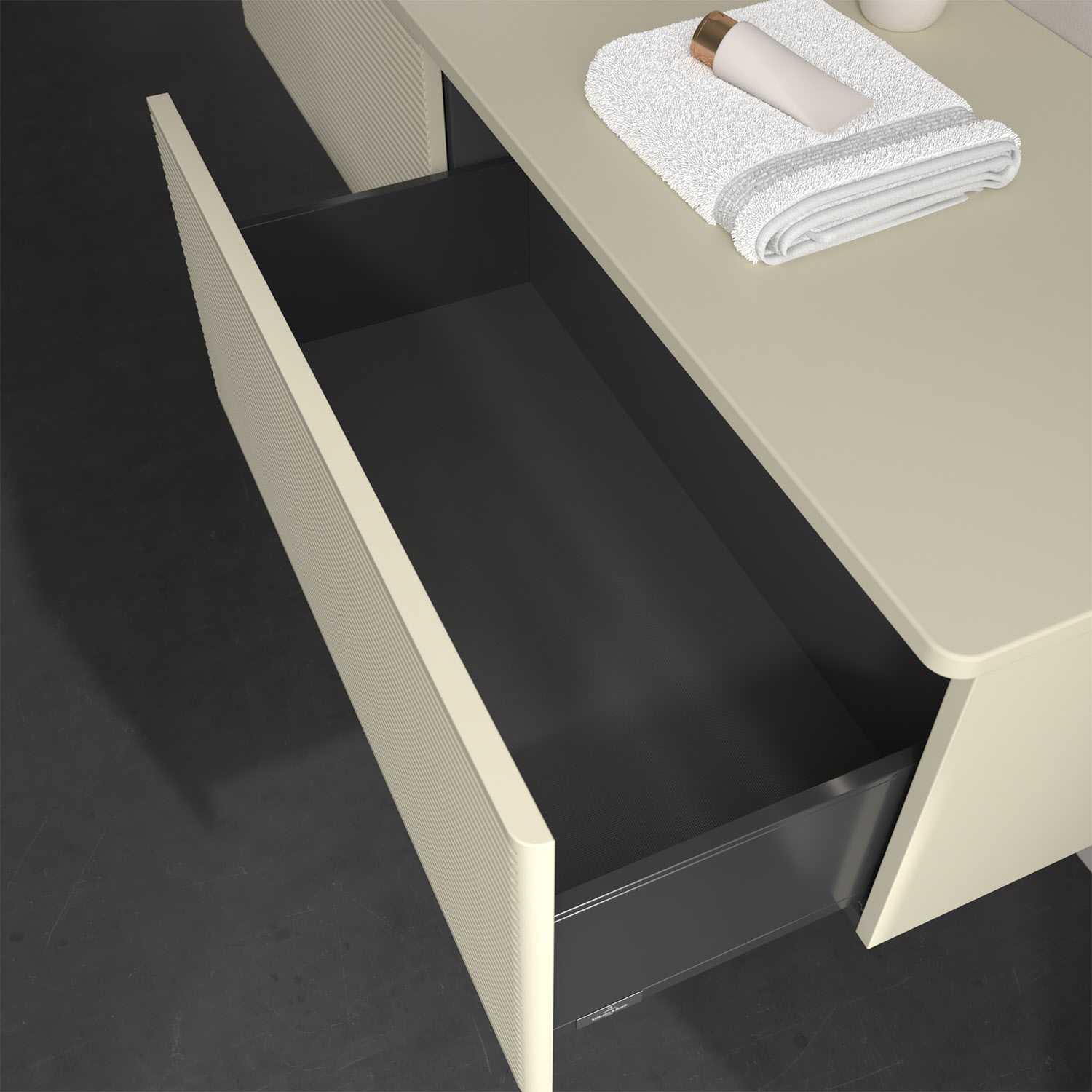 - kein Umfallen oder Verrutschen von Pflegeprodukten in den Schubladen dank rutschhemmendem Boden