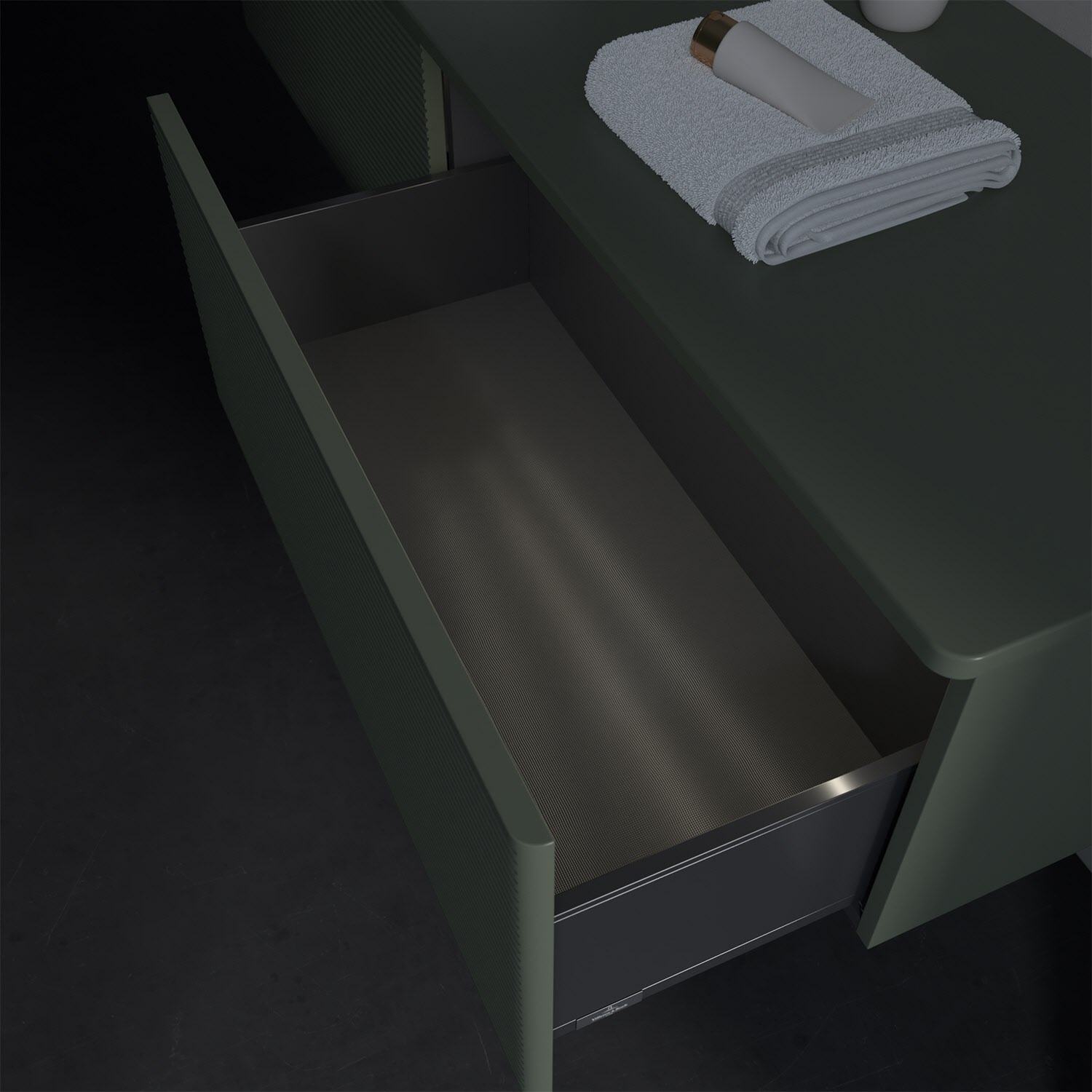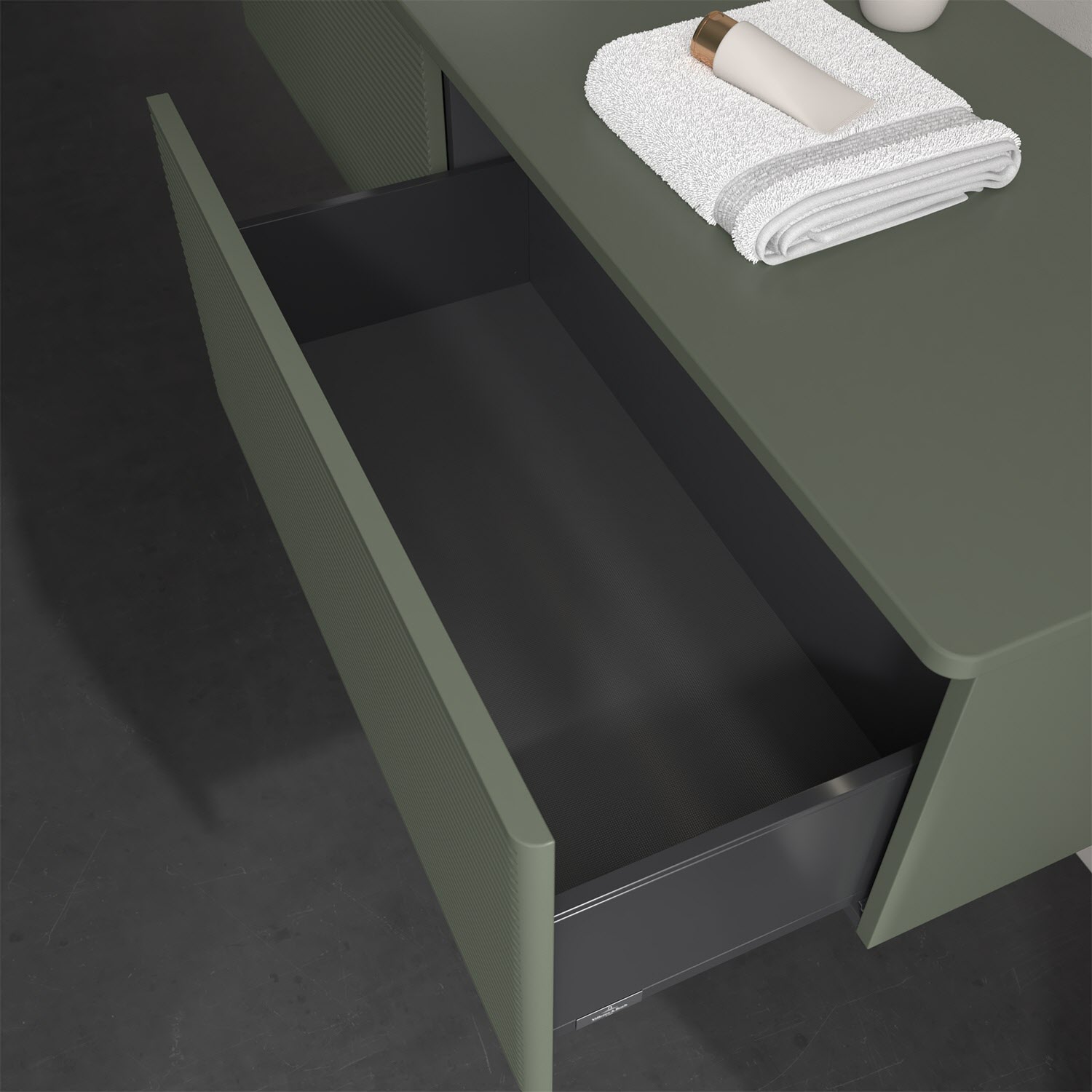 Der wandhängende Antao Waschtischunterschrank bietet mit seinen beiden extra hohen Auszügen und seiner erstaunlichen Größe viel Platz zum Verstauen von Utensilien im Badezimmer. Dank des seitlich platzierten Aufsatzwaschtischs gibt es daneben weiteren Platz für Handtücher, Seifenspender & Co. auf der Waschtischplatte. Inspiriert von der Natur überzeugt der Unterschrank auch optisch mit sanfter Formsprache und abgerundete Kanten. Die grifflosen Auszüge mit strukturierter Front sind mit der Push-to-Open Funktion ausgestattet und verfügen über einen Antirutschboden, damit Utensilien sicher verstaut werden können. Den Überblick behält man dank der warmweißen Auszugsbeleuchtung, die sich automatisch beim Öffnen einschaltet. Mit seiner Vollauszug- und Selbsteinzug-Funktion ist der Schrank einfach praktisch und leicht zu bedienen. Qualität von Villeroy & Boch! Für eine besonders leichte Pflege sorgt die mehrschichtig deckend lackierte Oberfläche.