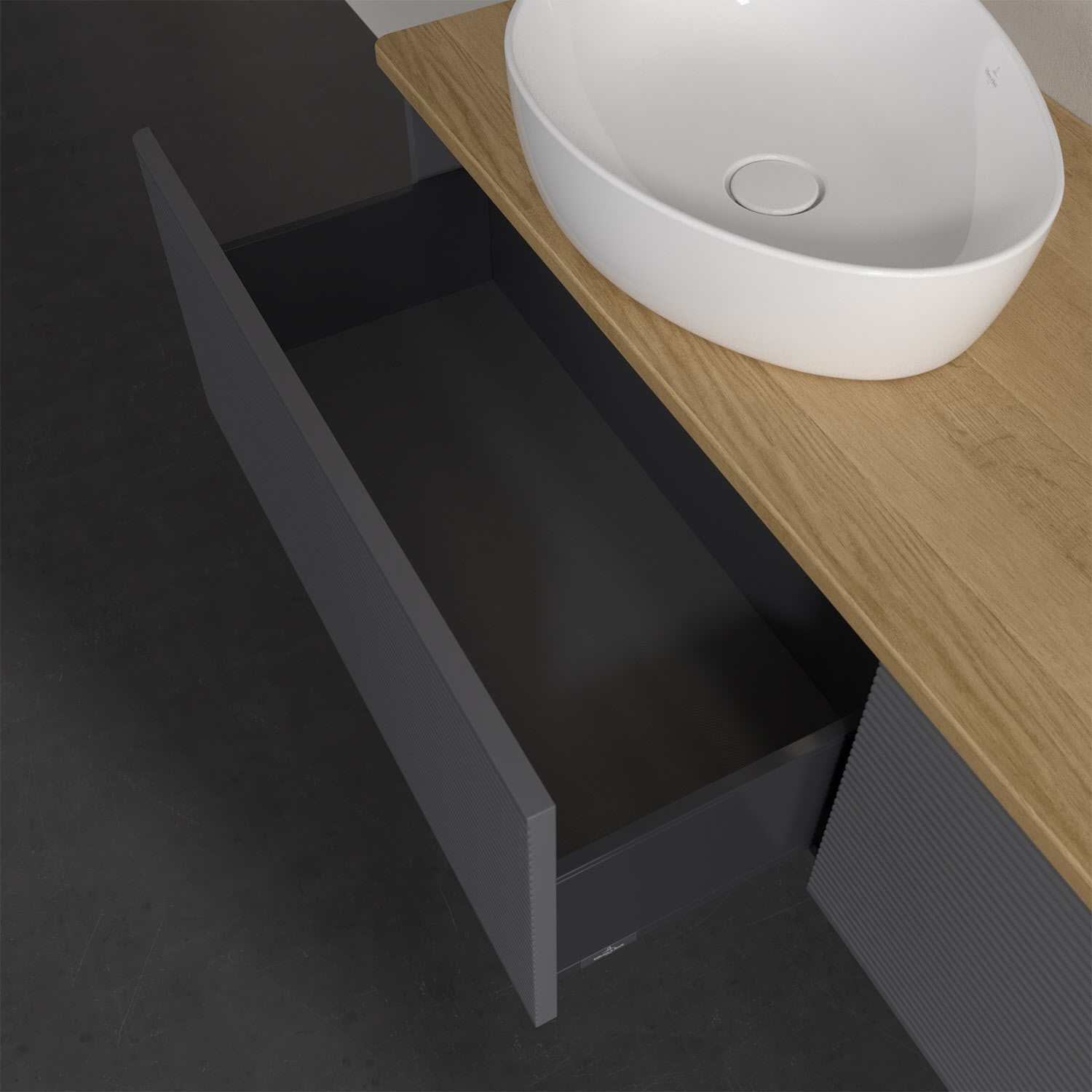 Villeroy & Boch Antao Waschbeckenunterschrank, 160 x 36 cm, 2 Auszüge mit LED-Licht, Front mit Struktur, ohne Hahnloch, für Waschtisch links