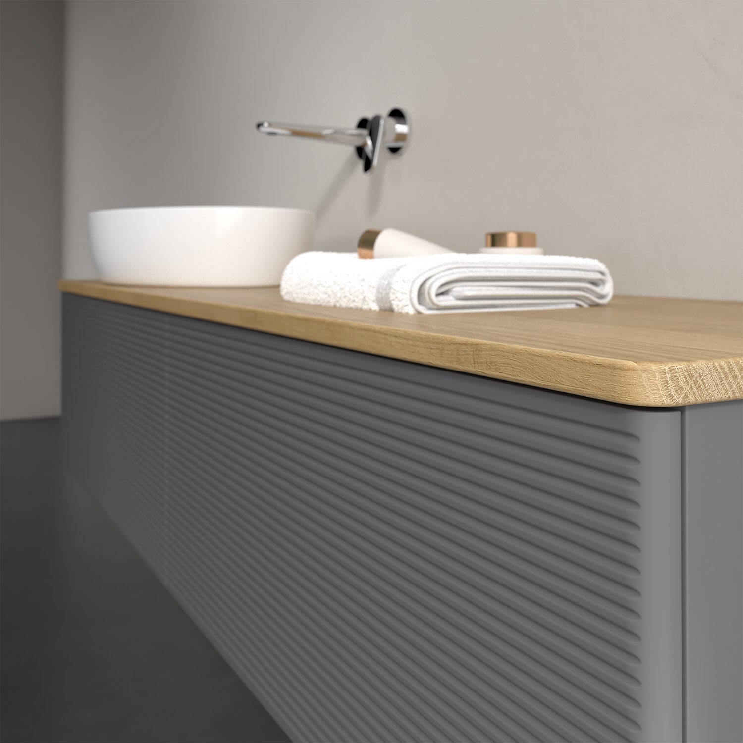 Der wandhängende Antao Waschtischunterschrank bietet mit seinen beiden extra hohen Auszügen und seiner erstaunlichen Größe viel Platz zum Verstauen von Utensilien im Badezimmer. Dank des seitlich platzierten Aufsatzwaschtischs gibt es daneben weiteren Platz für Handtücher, Seifenspender & Co. auf der Waschtischplatte. Inspiriert von der Natur überzeugt der Unterschrank auch optisch mit sanfter Formsprache und abgerundete Kanten. Die grifflosen Auszüge mit strukturierter Front sind mit der Push-to-Open Funktion ausgestattet und verfügen über einen Antirutschboden, damit Utensilien sicher verstaut werden können. Den Überblick behält man dank der warmweißen Auszugsbeleuchtung, die sich automatisch beim Öffnen einschaltet. Mit seiner Vollauszug- und Selbsteinzug-Funktion ist der Schrank einfach praktisch und leicht zu bedienen. Qualität von Villeroy & Boch! Für eine besonders leichte Pflege sorgt die mehrschichtig deckend lackierte Oberfläche. Bei der Ausführung in Massivholz wird dank des verarbeiteten Massivholzes jedes Möbel zu einem Unikat, das sich durch das lebendige Naturmaterial durch seine einzigartige Struktur und Maserung auszeichnet.