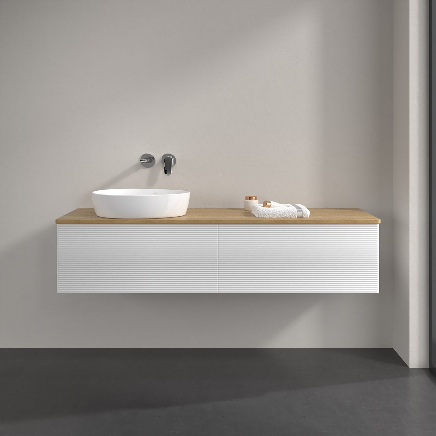 Villeroy & Boch Antao Waschbeckenunterschrank, 160 x 36 cm, 2 Auszüge mit LED-Licht, Front mit Struktur, ohne Hahnloch, für Waschtisch links