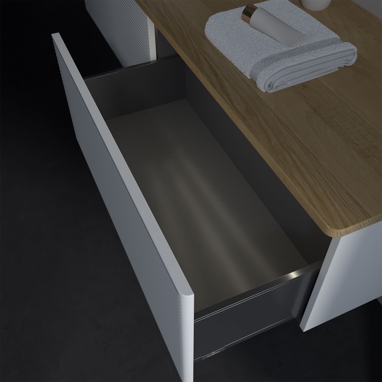 - kein Umfallen oder Verrutschen von Pflegeprodukten in den Schubladen dank rutschhemmendem Boden