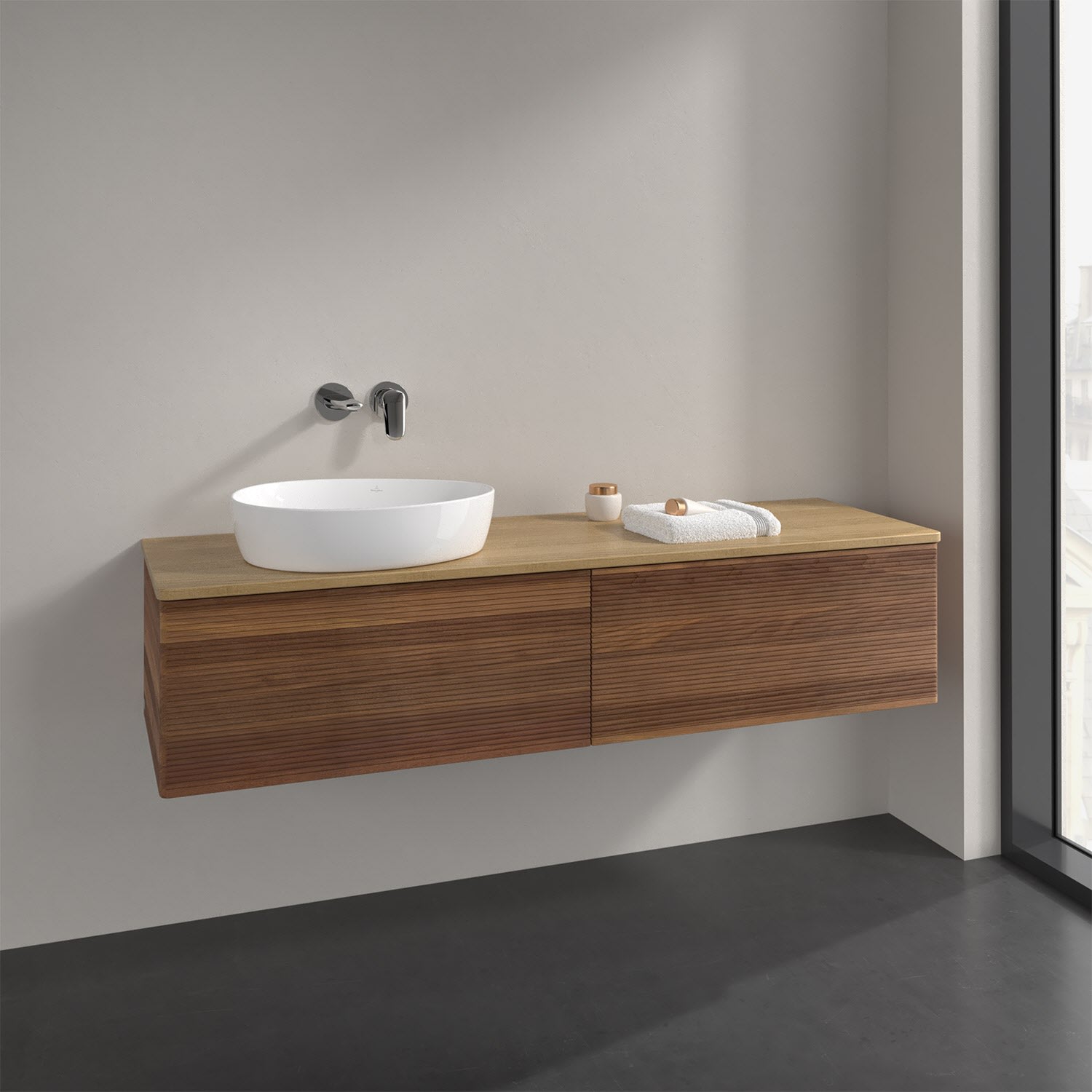 Villeroy & Boch Antao Waschbeckenunterschrank, 160 x 36 cm, 2 Auszüge mit LED-Licht, Front mit Struktur, ohne Hahnloch, für Waschtisch links