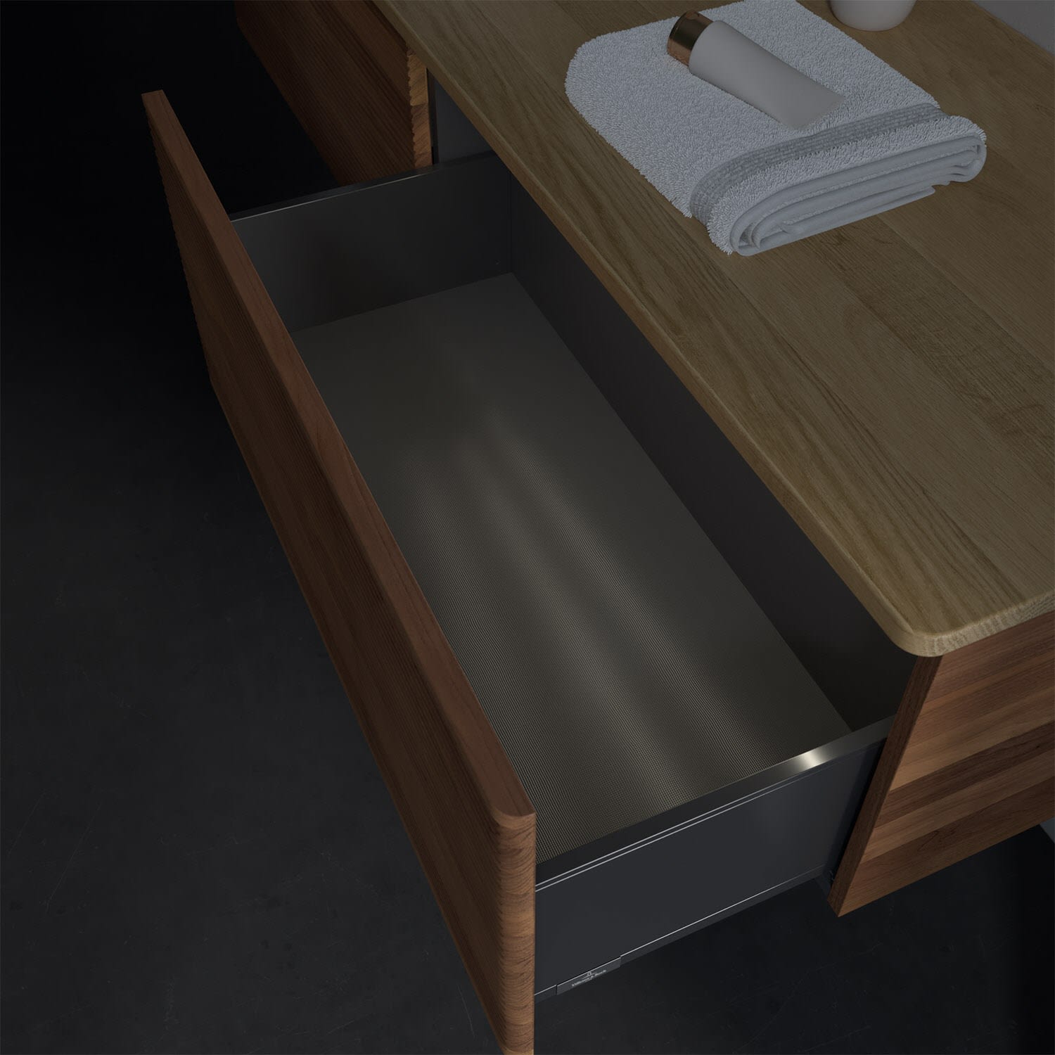 - kein Umfallen oder Verrutschen von Pflegeprodukten in den Schubladen dank rutschhemmendem Boden