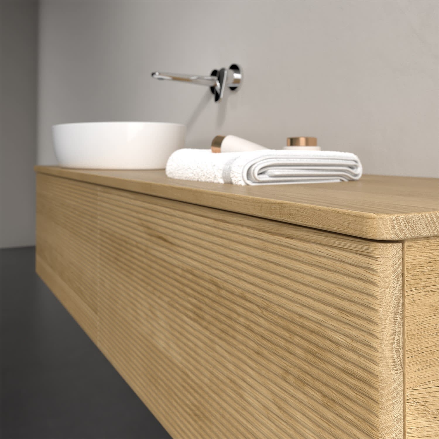 Der wandhängende Antao Waschtischunterschrank bietet mit seinen beiden extra hohen Auszügen und seiner erstaunlichen Größe viel Platz zum Verstauen von Utensilien im Badezimmer. Dank des seitlich platzierten Aufsatzwaschtischs gibt es daneben weiteren Platz für Handtücher, Seifenspender & Co. auf der Waschtischplatte. Inspiriert von der Natur überzeugt der Unterschrank auch optisch mit sanfter Formsprache und abgerundete Kanten. Die grifflosen Auszüge mit strukturierter Front sind mit der Push-to-Open Funktion ausgestattet und verfügen über einen Antirutschboden, damit Utensilien sicher verstaut werden können. Den Überblick behält man dank der warmweißen Auszugsbeleuchtung, die sich automatisch beim Öffnen einschaltet. Mit seiner Vollauszug- und Selbsteinzug-Funktion ist der Schrank einfach praktisch und leicht zu bedienen. Qualität von Villeroy & Boch! Für eine besonders leichte Pflege sorgt die mehrschichtig deckend lackierte Oberfläche. Bei der Ausführung in Massivholz wird dank des verarbeiteten Massivholzes jedes Möbel zu einem Unikat, das sich durch das lebendige Naturmaterial durch seine einzigartige Struktur und Maserung auszeichnet.