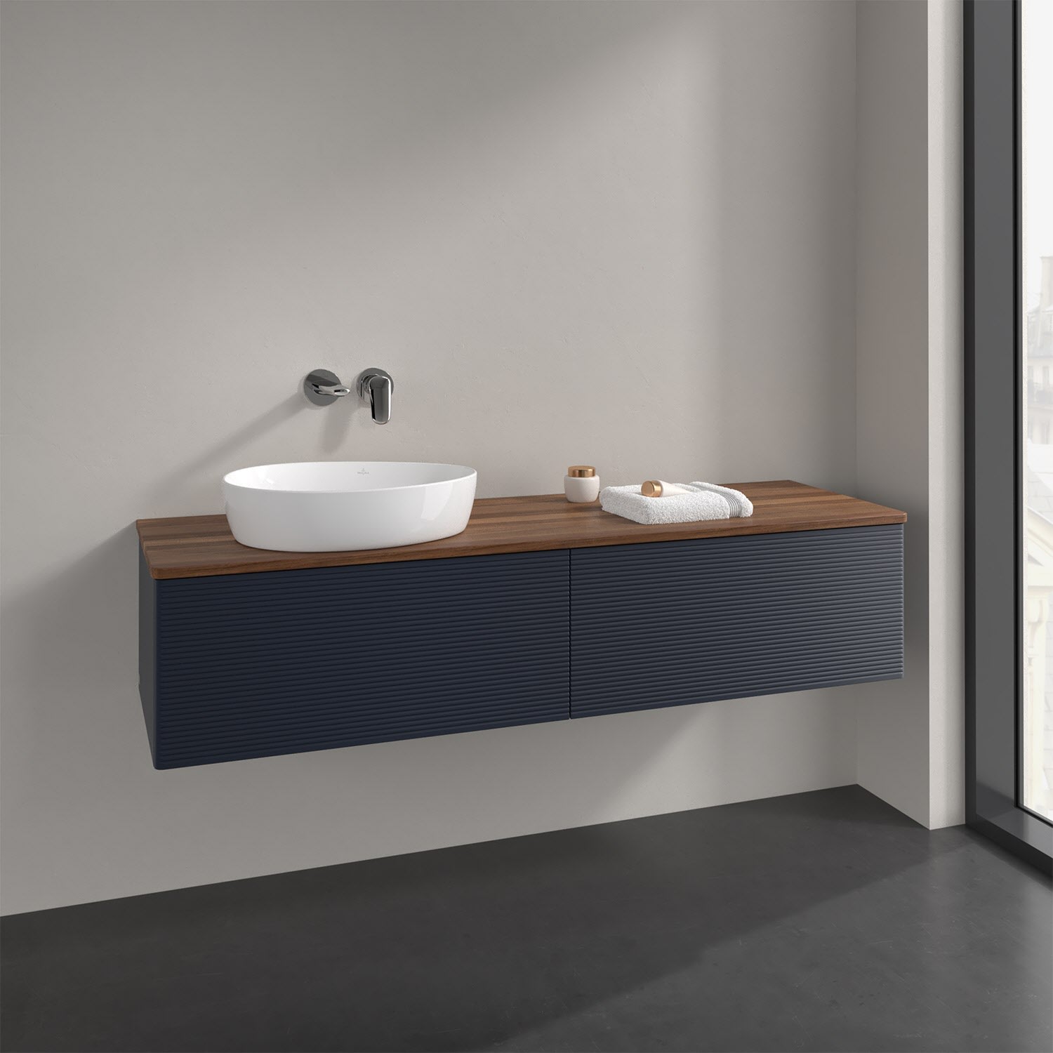 Villeroy & Boch Antao Waschbeckenunterschrank, 160 x 36 cm, 2 Auszüge mit LED-Licht, Front mit Struktur, ohne Hahnloch, für Waschtisch links