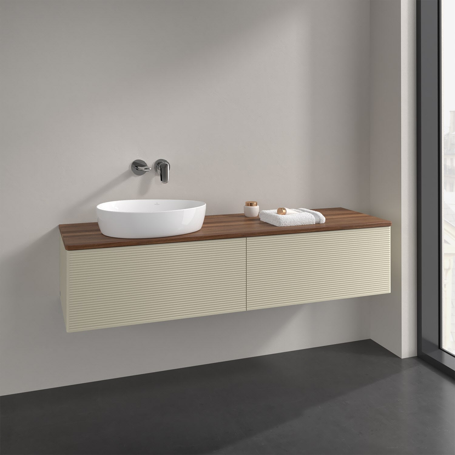 Villeroy & Boch Antao Waschbeckenunterschrank, 160 x 36 cm, 2 Auszüge mit LED-Licht, Front mit Struktur, ohne Hahnloch, für Waschtisch links