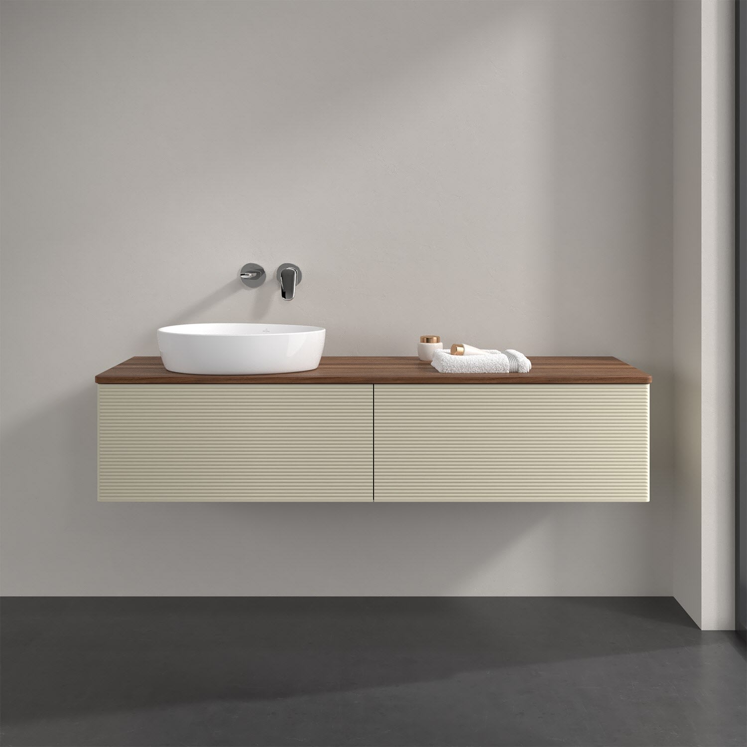 Für diesen Waschbeckenunterschrank stehen Ihnen Aufsatzwaschtische aus verschiedenen Serien zur Verfügung (siehe "Passliste" unter Downloads). Ein ausgewähltes Beispiel finden Sie im Zubehör. Den Waschtisch bitte separat mitbestellen.