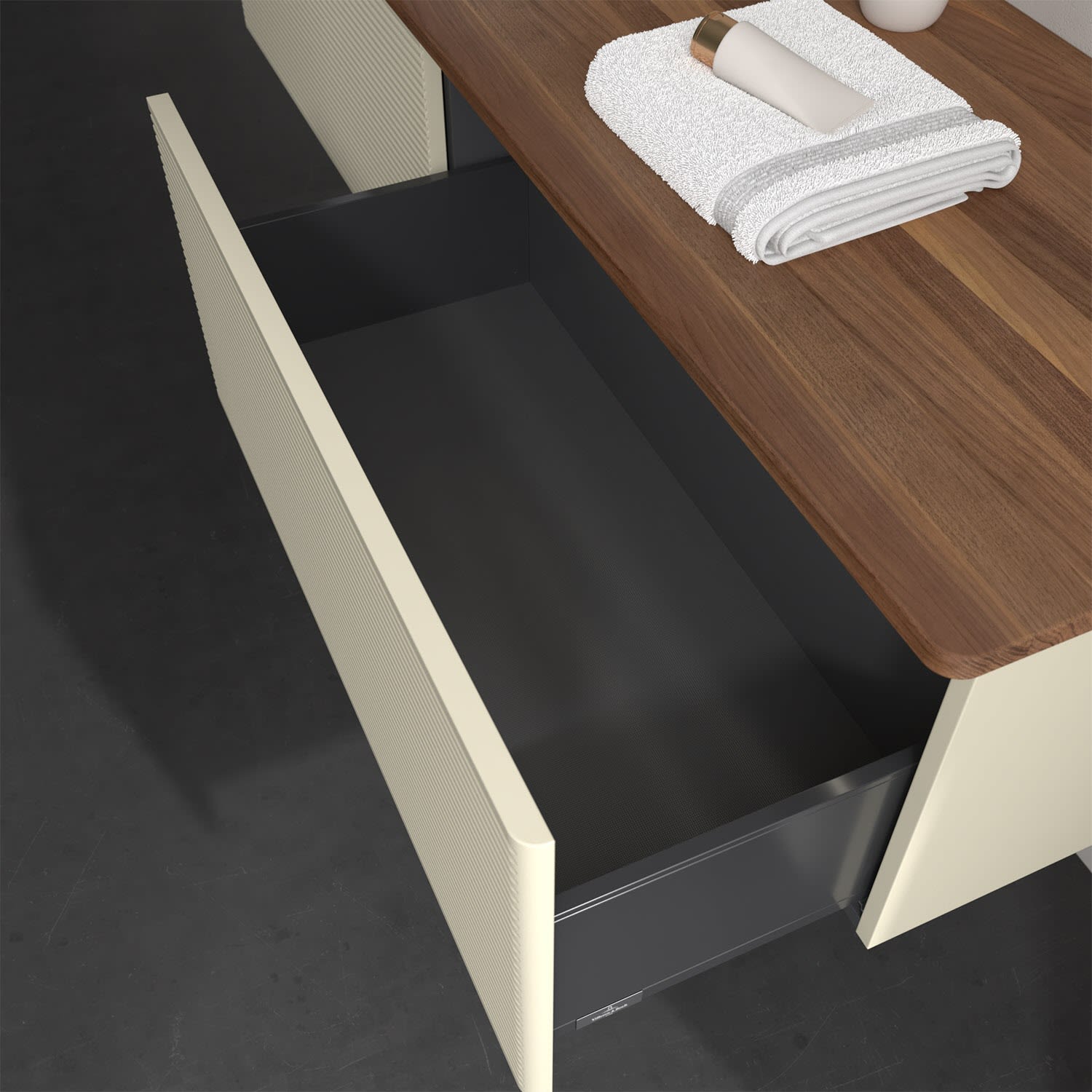 - kein Umfallen oder Verrutschen von Pflegeprodukten in den Schubladen dank rutschhemmendem Boden
