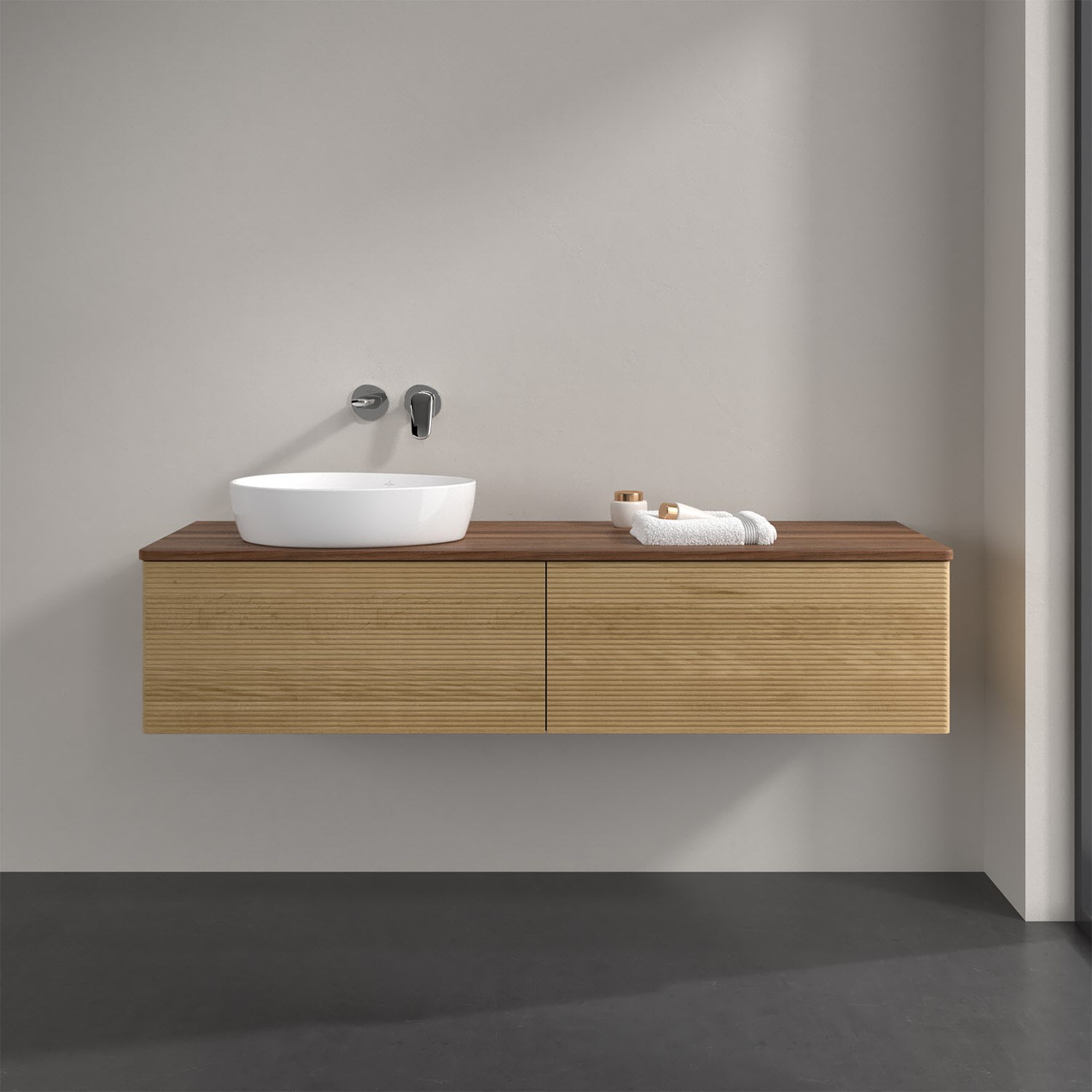 Villeroy & Boch Antao Waschbeckenunterschrank, 160 x 36 cm, 2 Auszüge mit LED-Licht, Front mit Struktur, ohne Hahnloch, für Waschtisch links