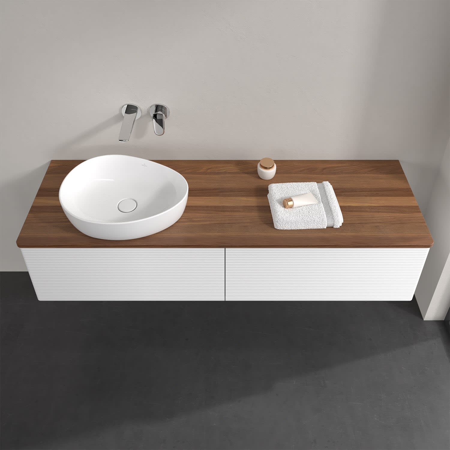Für diesen Waschbeckenunterschrank stehen Ihnen Aufsatzwaschtische aus verschiedenen Serien zur Verfügung (siehe "Passliste" unter Downloads). Ein ausgewähltes Beispiel finden Sie im Zubehör. Den Waschtisch bitte separat mitbestellen.