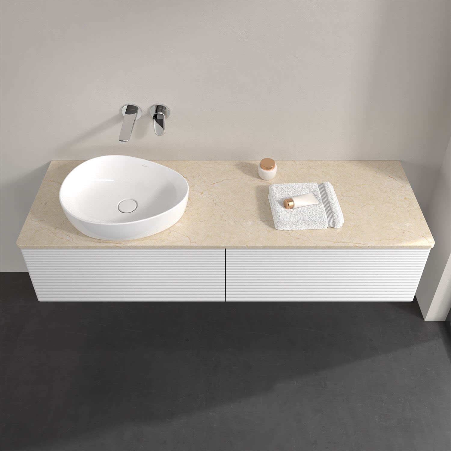 Für diesen Waschbeckenunterschrank stehen Ihnen Aufsatzwaschtische aus verschiedenen Serien zur Verfügung (siehe "Passliste" unter Downloads). Ein ausgewähltes Beispiel finden Sie im Zubehör. Den Waschtisch bitte separat mitbestellen.