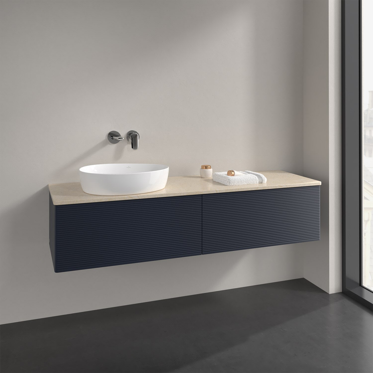 Villeroy & Boch Antao Waschbeckenunterschrank, 160 x 36 cm, 2 Auszüge mit LED-Licht, Front mit Struktur, ohne Hahnloch, für Waschtisch links