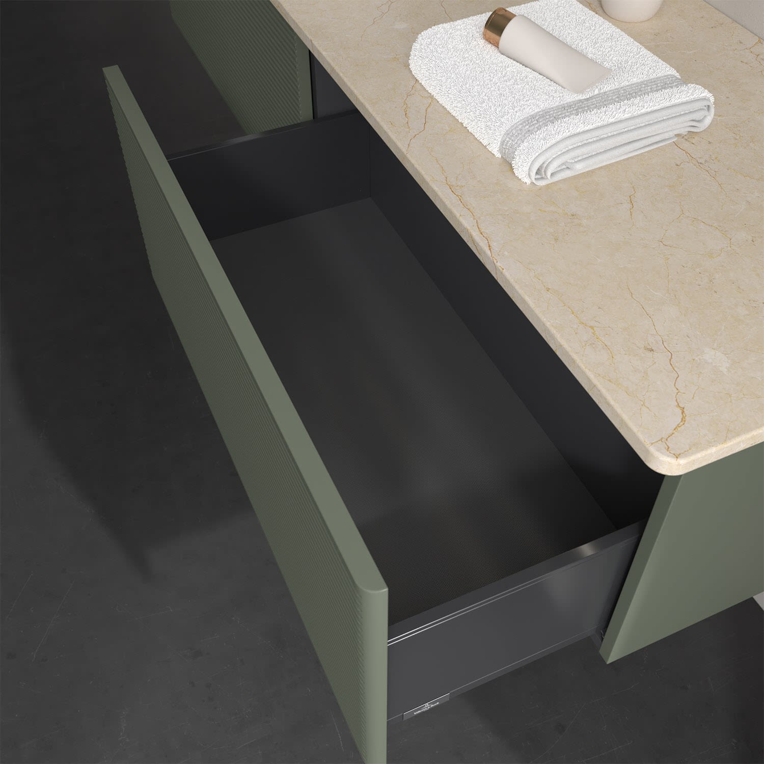 - kein Umfallen oder Verrutschen von Pflegeprodukten in den Schubladen dank rutschhemmendem Boden