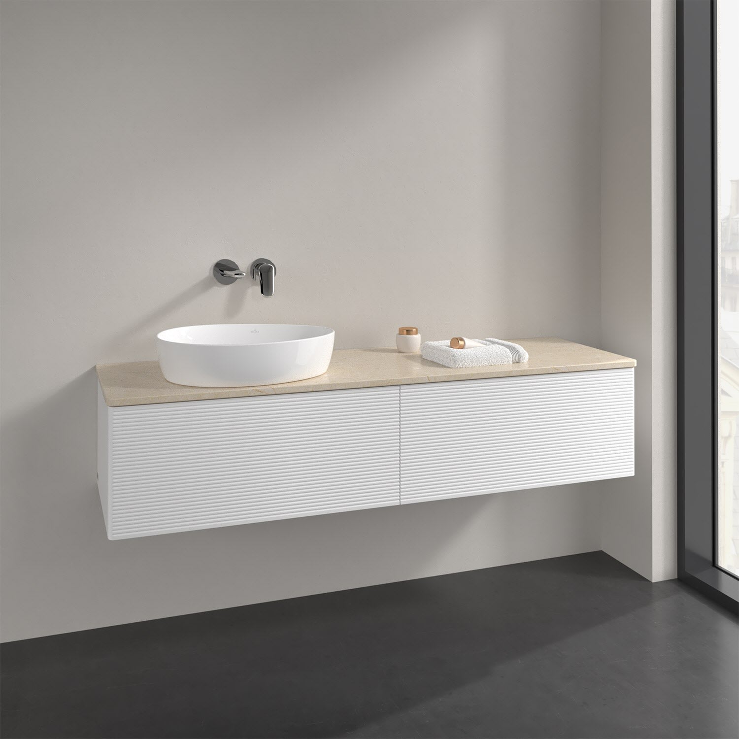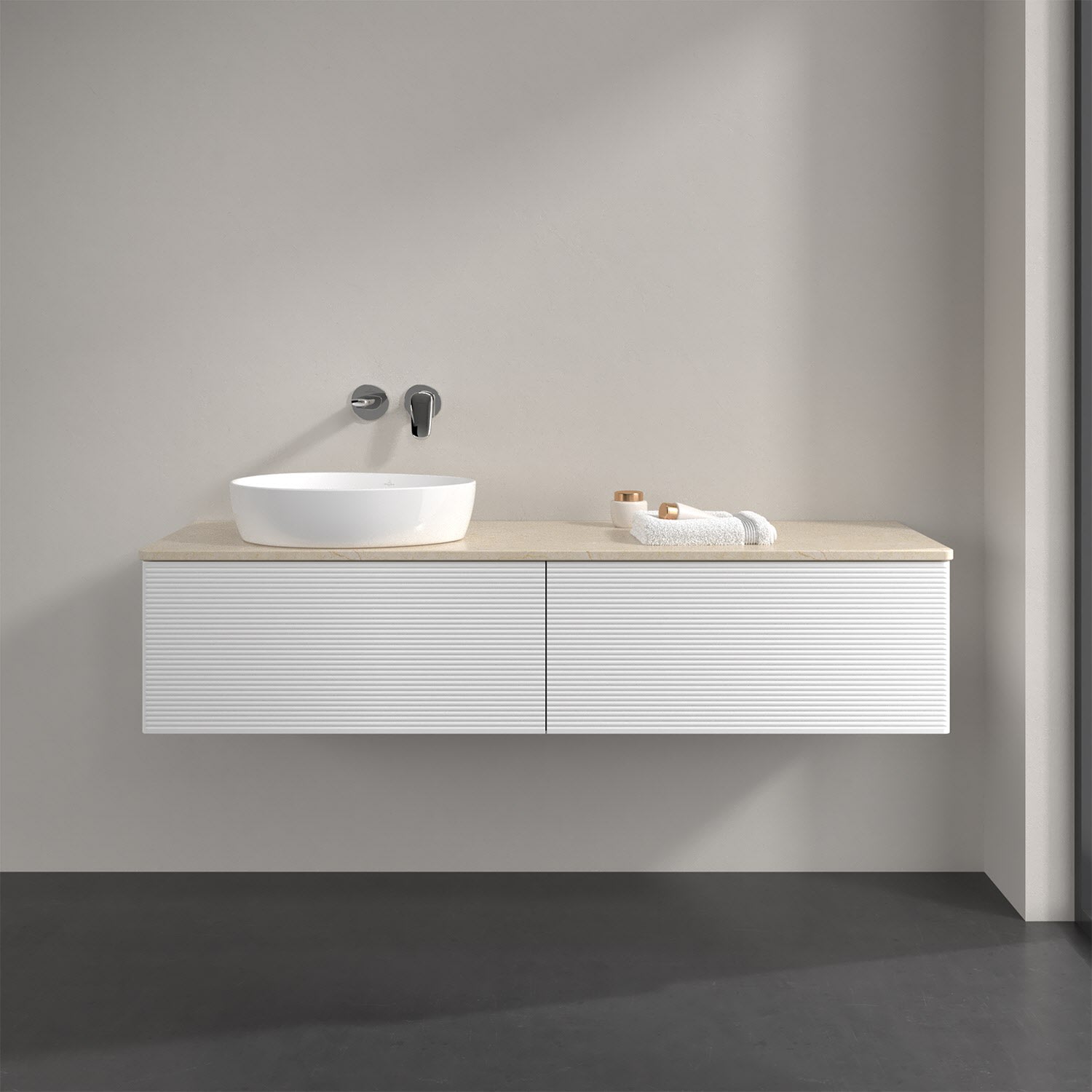 Villeroy & Boch Antao Waschbeckenunterschrank, 160 x 36 cm, 2 Auszüge mit LED-Licht, Front mit Struktur, ohne Hahnloch, für Waschtisch links