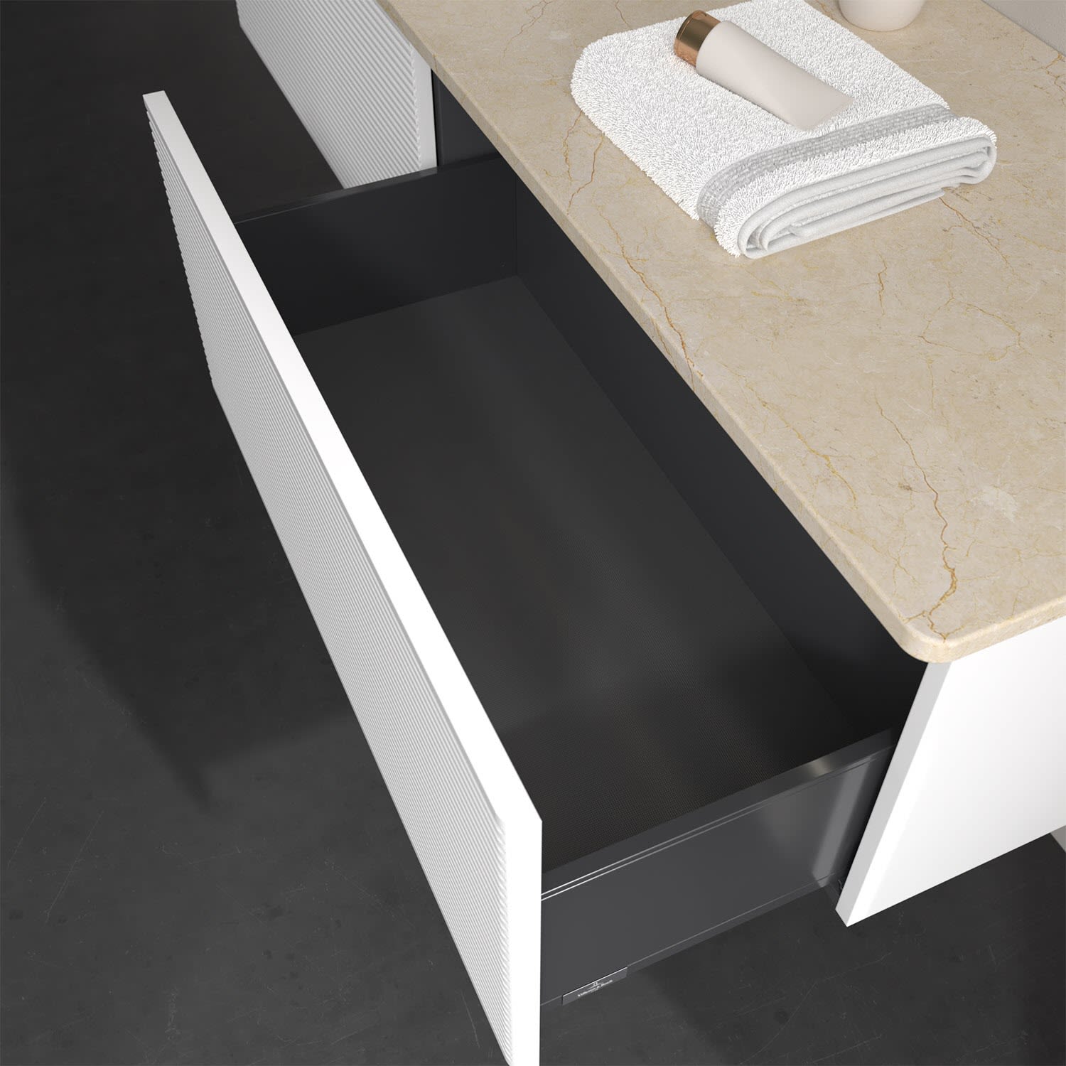 - kein Umfallen oder Verrutschen von Pflegeprodukten in den Schubladen dank rutschhemmendem Boden